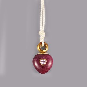in oro giallo con cuore di rubino massivo centrato da un corindone rosa, gr. 9,7. Dimensioni 3,2 x 2 cm ca.