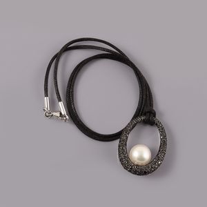 in oro bianco a forma ovale in pavé di diamanti neri con al centro una perla coltivata, gr. 7,2. Sostenuto da [..]