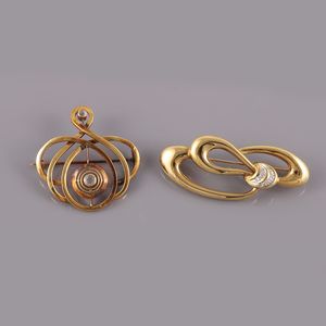 in oro giallo rispettivamente a cartiglio con diamanti taglio a rosa e a nastro con piccoli diamanti, gr. complessivi [..]