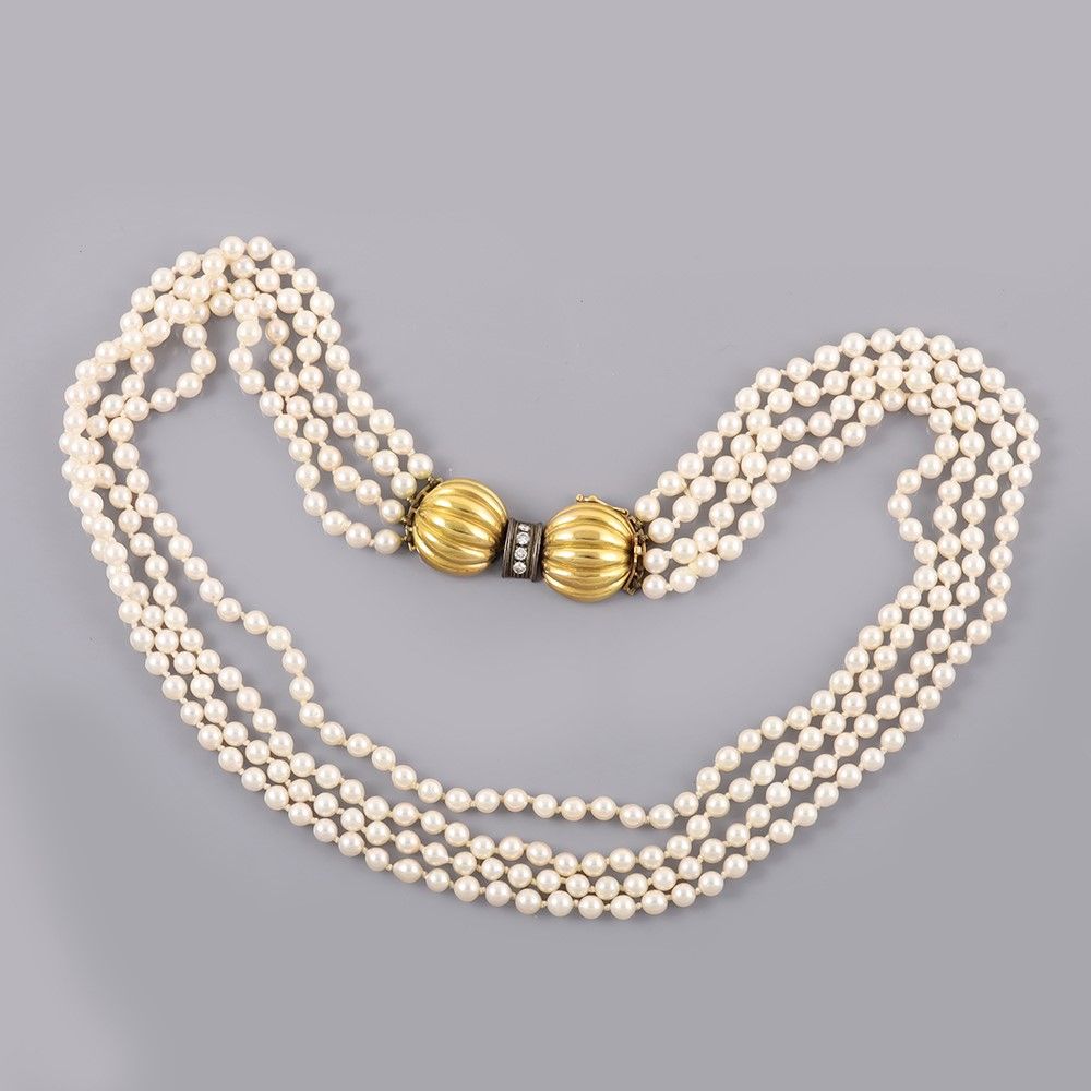 a quattro fili di perle coltivate con chiusura formata da due semisfere scanalate, raccordate da un cavallotto in argento con diamanti. Lunghezza 44 cm