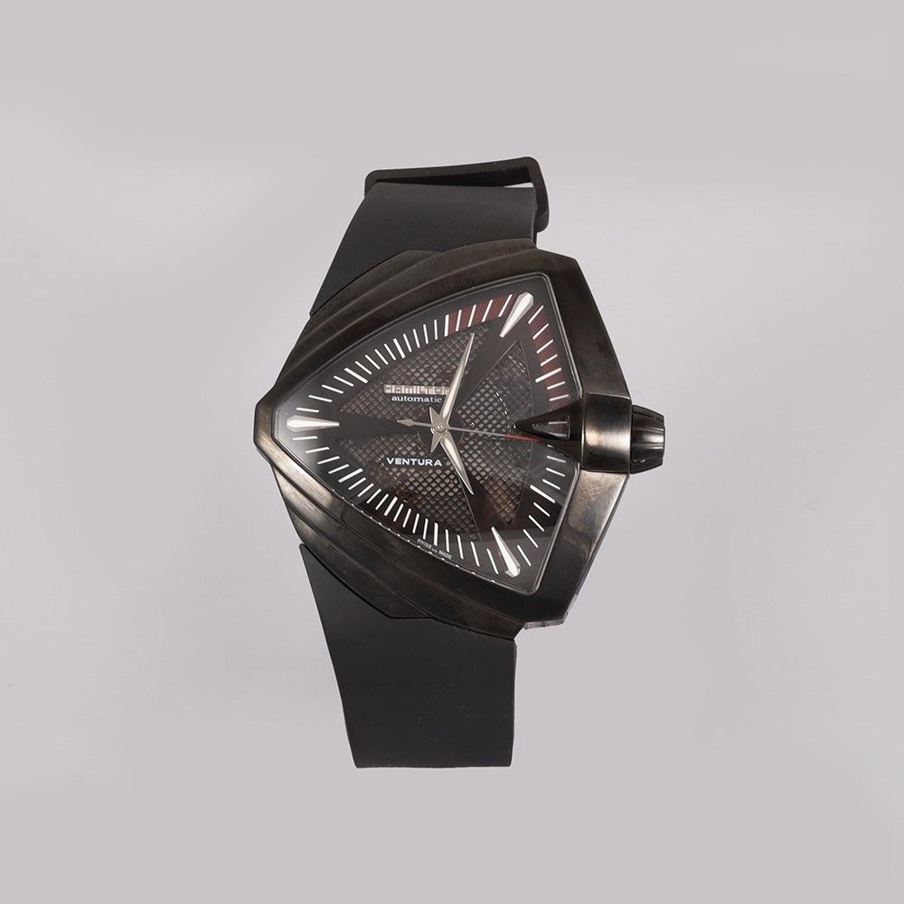 Ref: XXL 'Ventura Elvis Anniversary' Cassa: in PVD, fondello trasparente con movimento a vista. Vetro zaffiro Quadrante: Nero, indici a dardo. Sfere Dauphine Movimento: automatico Cinturino: originale in gomma, fibbia originale Anno: 2014 circa DIM: 45 x 46 mm Accessori: scatola originale Nota: Il Ventura originale, presentato nel 1957, pasṣ alla storia dell'orologeria come il primo orologio elettrico a batteria al mondo.
