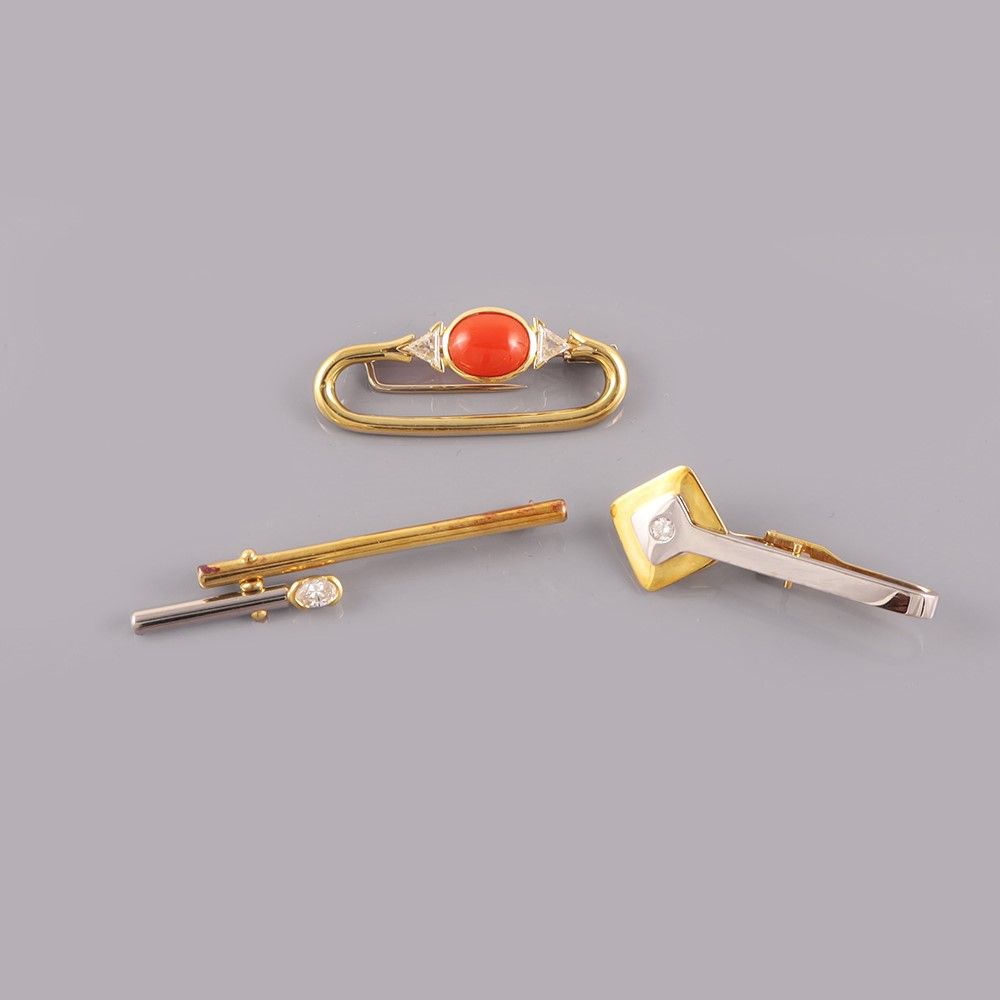 composto da un fermacravatta in oro giallo e bianco con piccolo brillante, una spilla in oro giallo e platino con diamante ovale e una spilla in oro giallo con corallo e diamanti triangolari, gr. complessivi 23,3. Fermacravatta firmato: Lorenzo Lorenzini Una spilla firmata: Monile