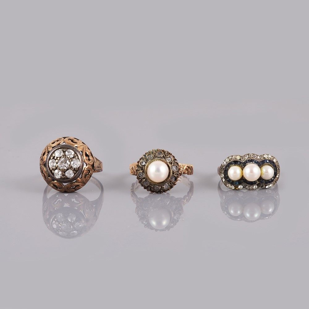 composto da tre anelli realizzati in oro e argento con diamanti, perle (due imitazioni) e pietre sintetiche, gr. complessivi 14,3. Misura 15 - 13,5 - 13