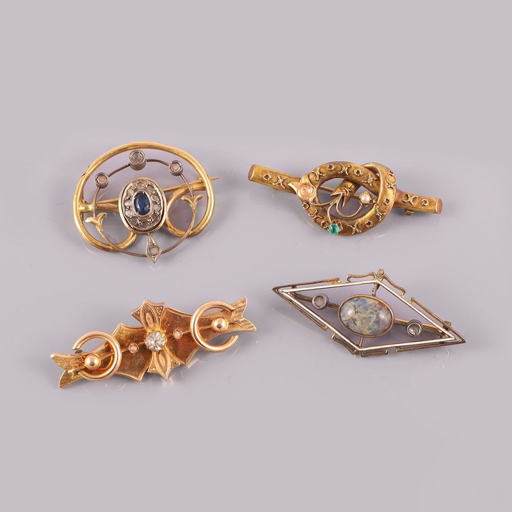 composto da quattro spille a differenti fogge, realizzate in oro e in argento e oro, con pietre sintetiche, pietra dura, piccoli diamanti e smalto, gr. complessivi 18,6. Dimensioni diverse