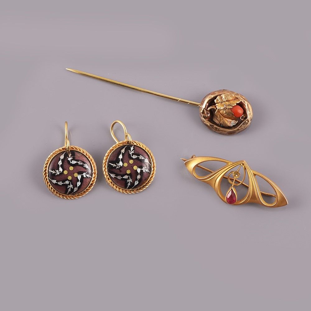 in oro a titoli diversi, composto da due spille e un paio di orecchini con smalti (mancanze), corallo e pietra sintetica rossa, gr. complessivi 8,5.