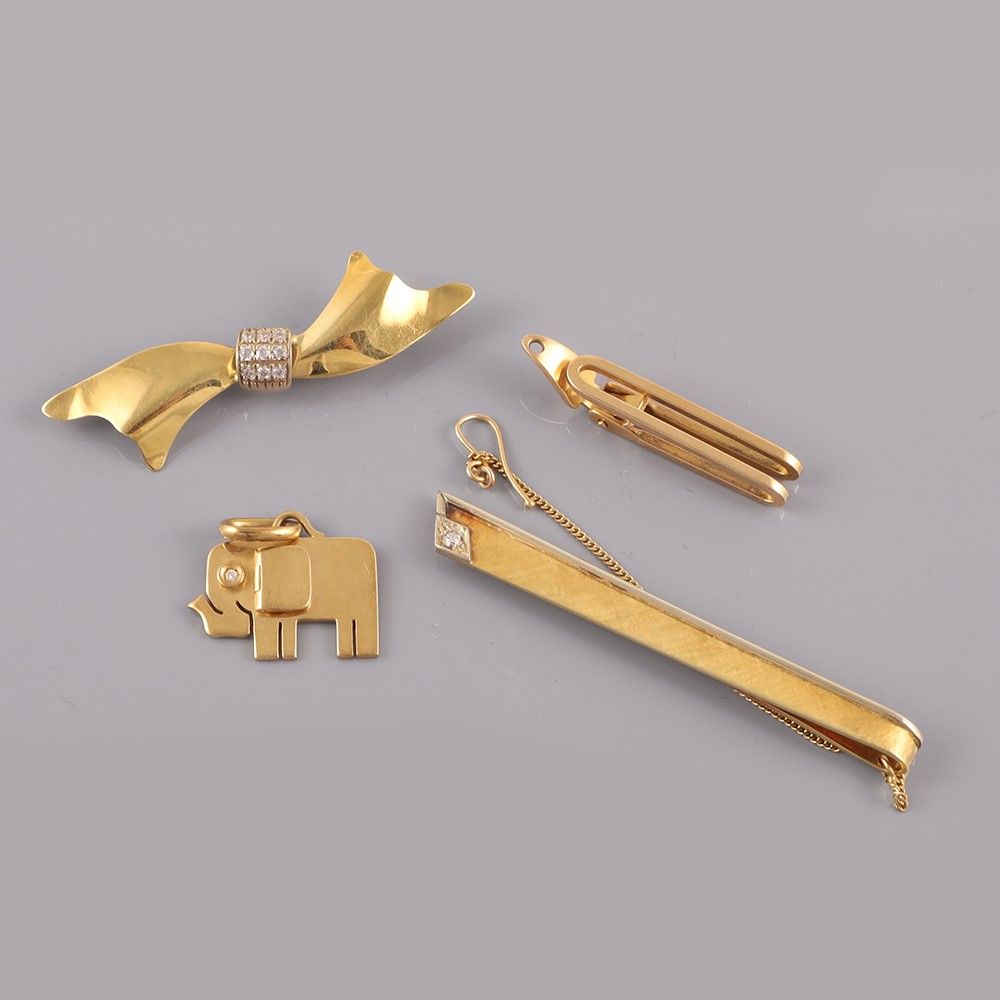 in oro composto da due fermacravatta di cui uno con pietra sintetica, una spilla a fiocco con pietre sintetiche e un pendente a guisa di elefantino con piccolo brillante, gr. complessivi 26,2.