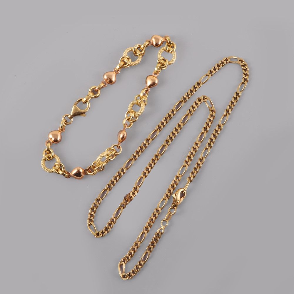 composto da un bracciale in oro giallo e rosa con motivi a cuore e una catena in oro giallo, gr. complessivi 20,4. Lunghezza 41 cm e 18 cm