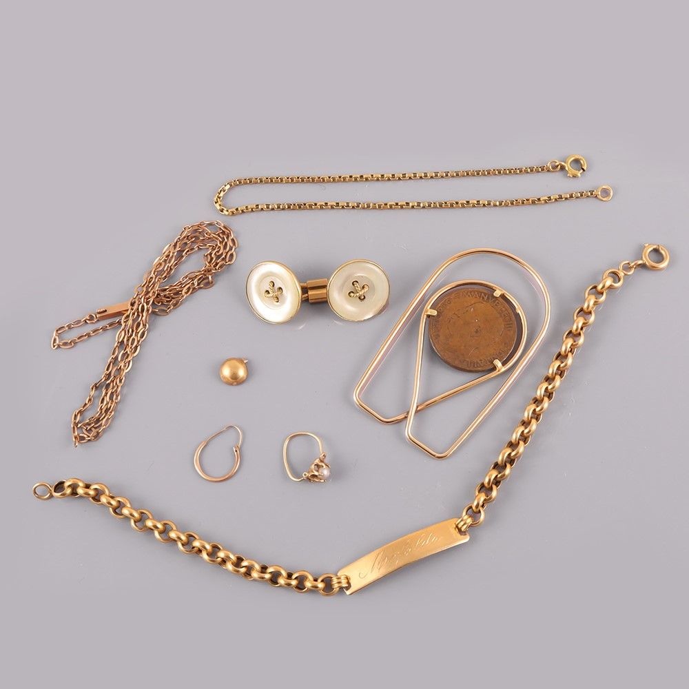 in oro, composto da due bracciali, un fermasoldi con moneta in metallo, una catena (rottura), un gemello con madreperla, due orecchini e una piccola semisfera, gr. complessivi 36,5