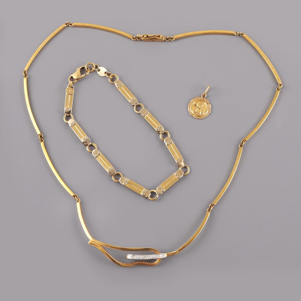 in oro, composto da girocollo con piccoli diamanti, bracciale a barrette e medaglia, gr. complessivi 26,7. Lunghezza collana 40 cm ca., bracciale 19 cm