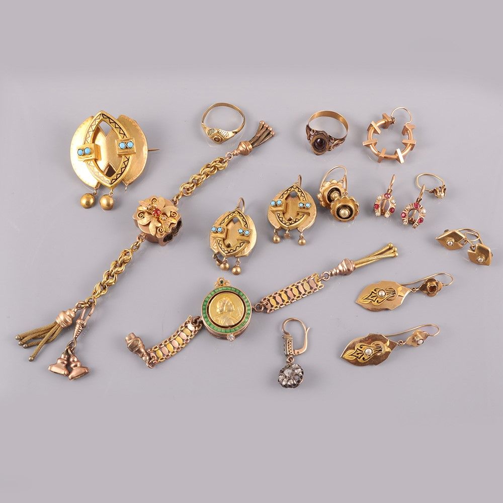 composto da orecchini di differenti fogge, due chatelaine, una spilla e due anelli, in oro a titolo basso, gr. complessivi 54,2.