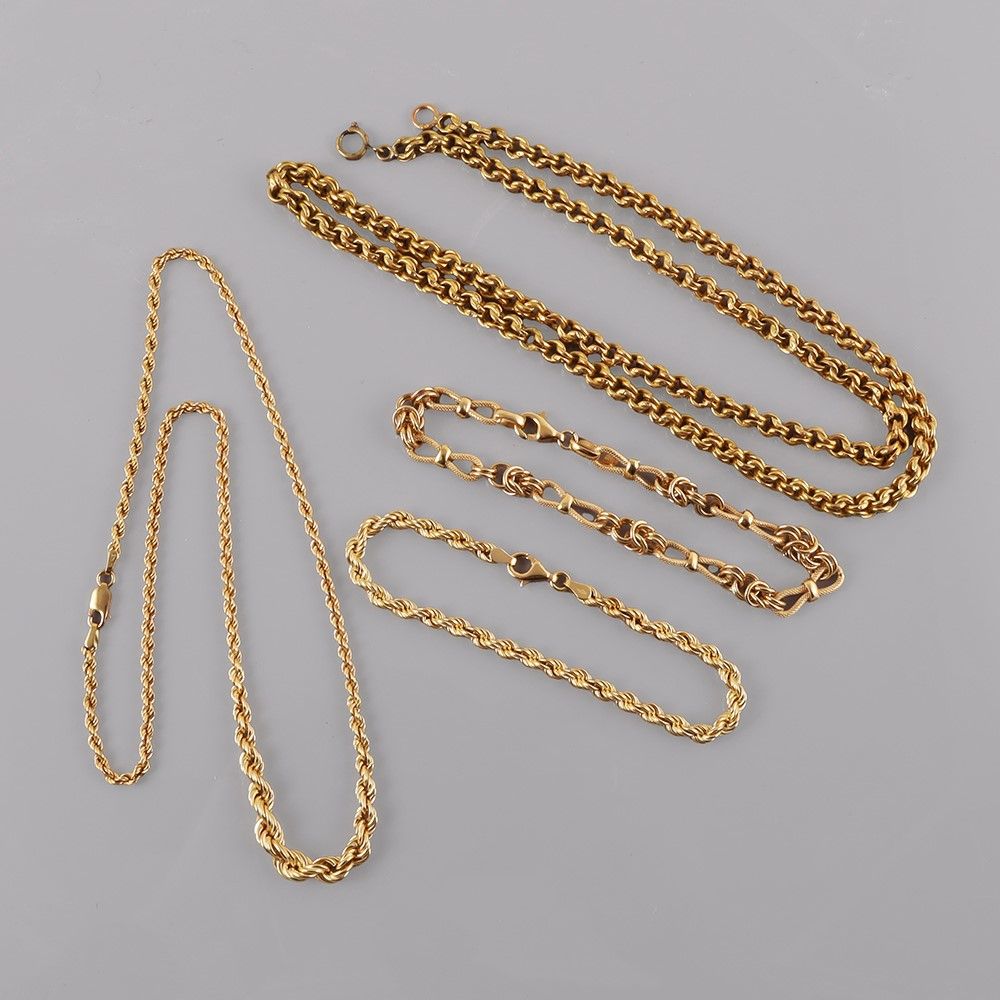 in oro giallo composto da bracciali e due collane, una con moschettone in oro a titolo basso, gr. complessivi 35,5. Lunghezza collane 60 cm, 45 cm; bracciali 20 cm, 19 cm