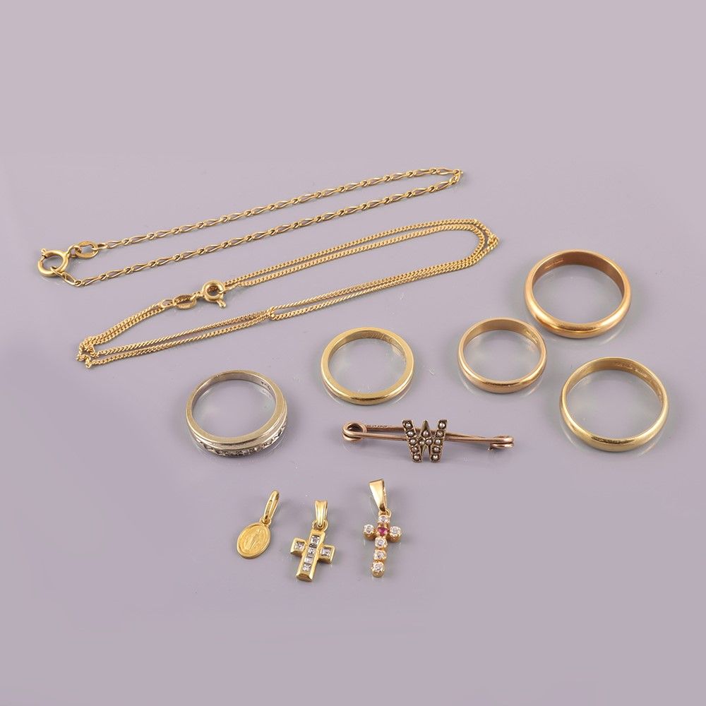 in oro, composto da quattro fedi, un anello con pietre sintetiche, un braccialetto, una catenella, due pendenti a croce con diamanti taglio carré e pietre sintetiche e piccola medaglia. Una spilla in oro a titolo basso, gr. complessivi 25,7.