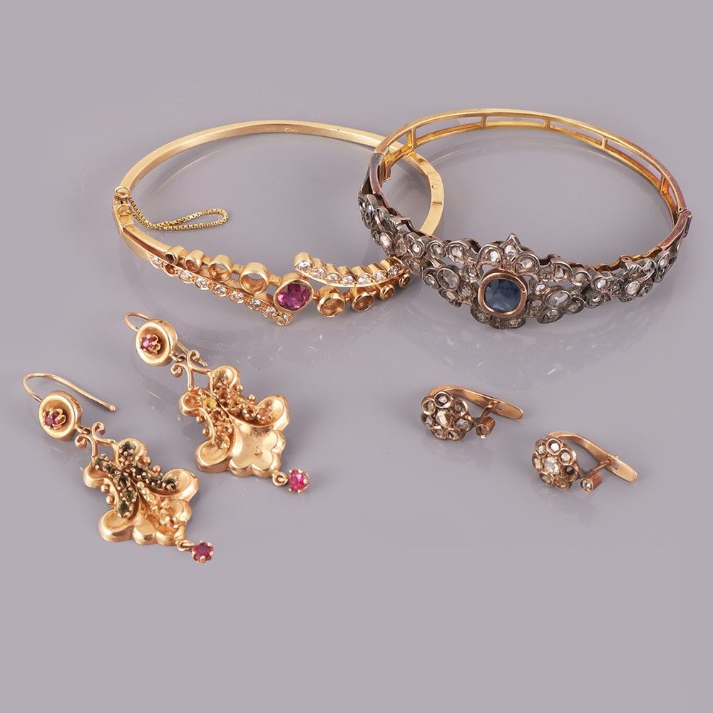 in oro 18KT, argento e oro a titolo basso, composto da un bracciale rigido con zaffiro e diamanti taglio a rosa, un bracciale rigido con rubino e brillanti e due paia di orecchini con diamanti a rosa e piccoli rubini (mancanze), gr. complessivi 43. Misura bracciali 16,5 cm ca.