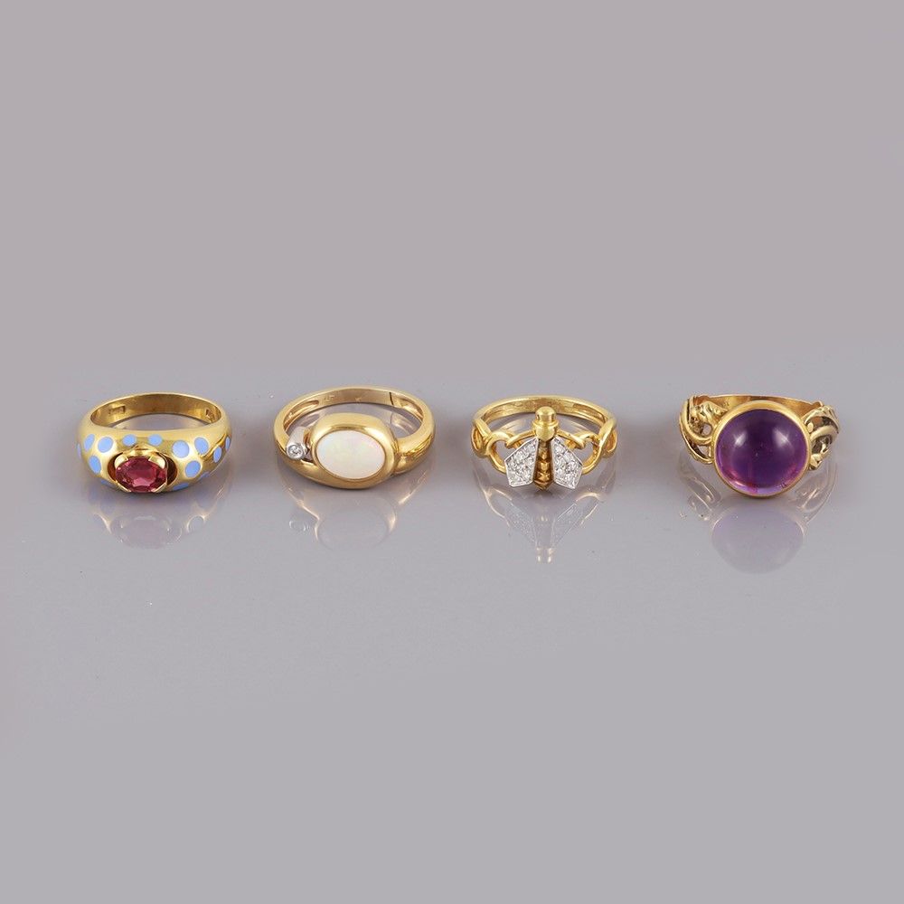 in oro giallo e bianco, a differenti fogge con tormalina, smalto, ametista, opale e piccoli diamanti, gr. complessivi 19,5. Misura 19, 15, 14, 12