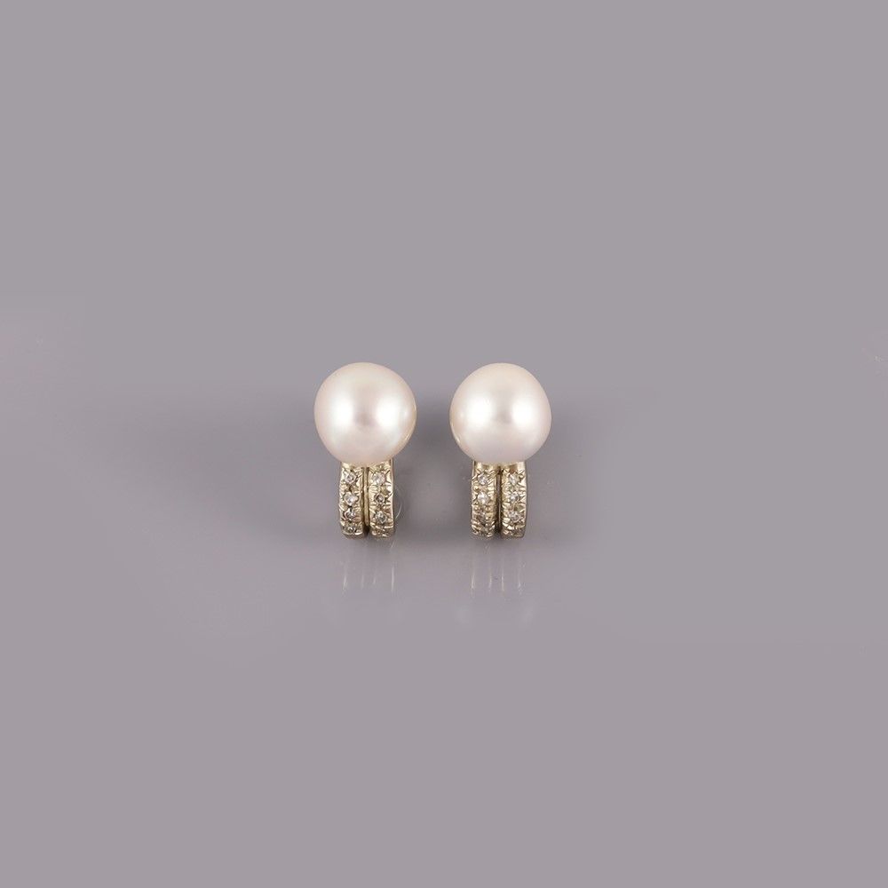 a clip con vite in oro bianco, perle coltivate e piccoli diamanti, gr. 7,4.