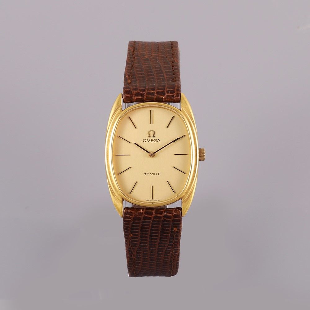 Cassa: in oro giallo 18K Quadrante: champagne, indici a bastone Movimento: manuale Cinturino: fibbia originale placcata DIM: 26 x 34 mm