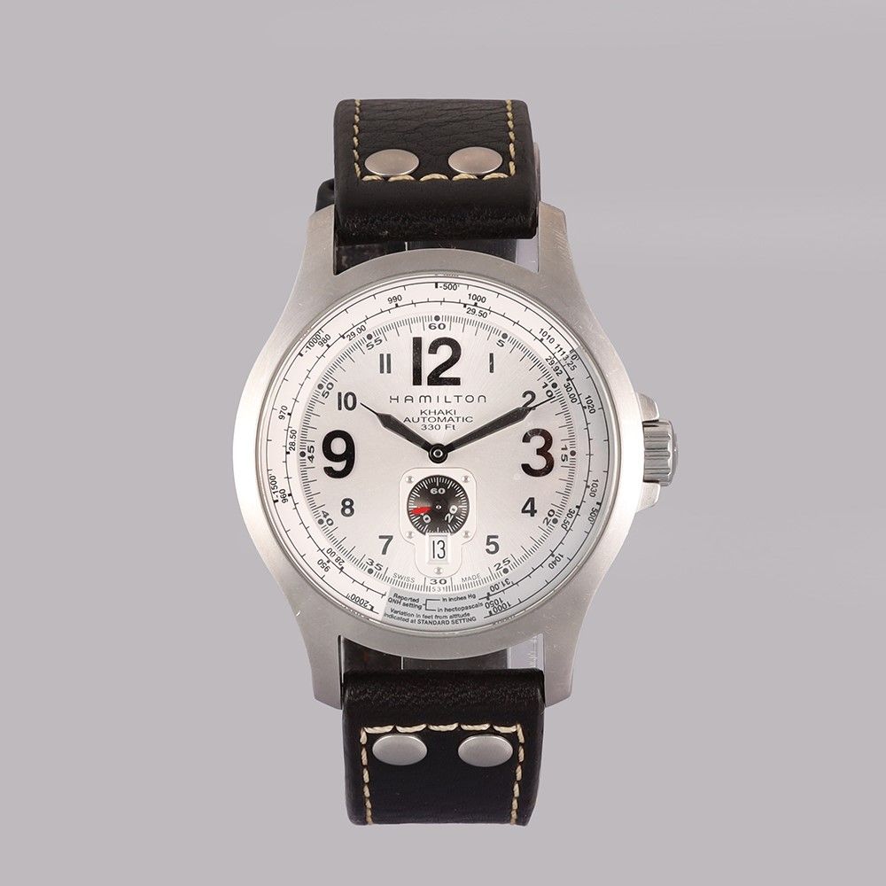 Ref: 'Khaki' Cassa: in acciaio, movimento a vista trasparente. Vetro zaffiro Quadrante: argento, numeri Arabi, datario. Sfere a a bastone Movimento: automatico Cinturino: fibbia originale DIAM: 44 mm