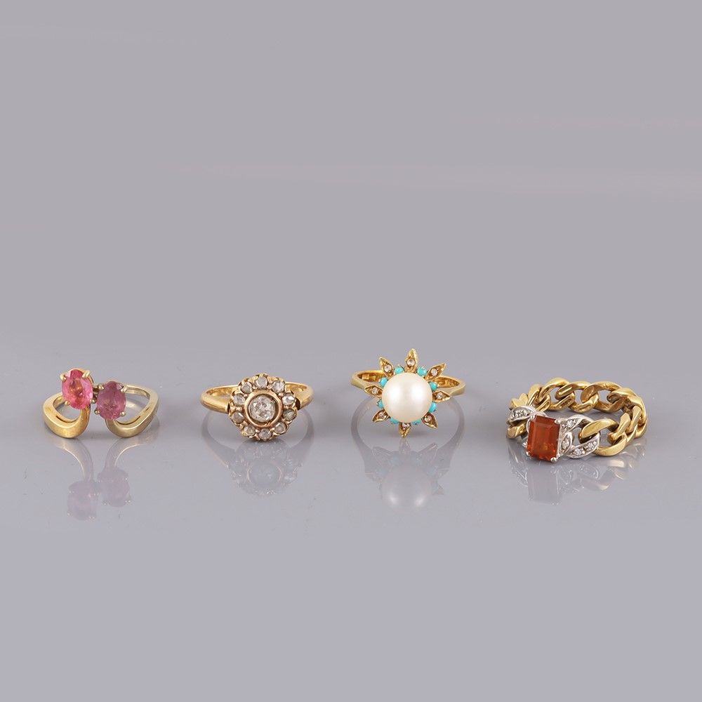 in oro, a differenti fogge con diamanti, quarzo, tormaline, perla coltivata e turchesi, gr. complessivi 19,5. Misura 13, 15, 18