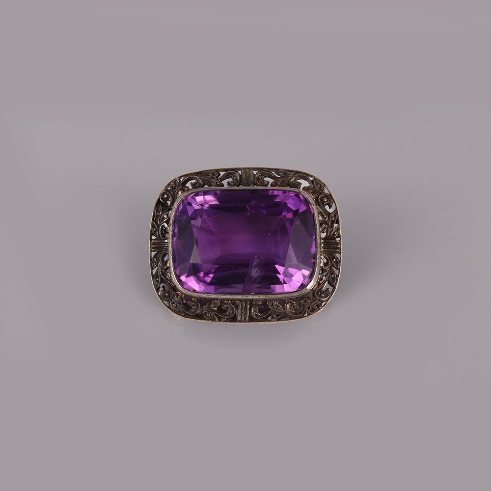 con grande ametista entro cornice traforata, realizzata in oro e argento, gr. 11,9. Dimensioni 3 x 2,4 cm ca.