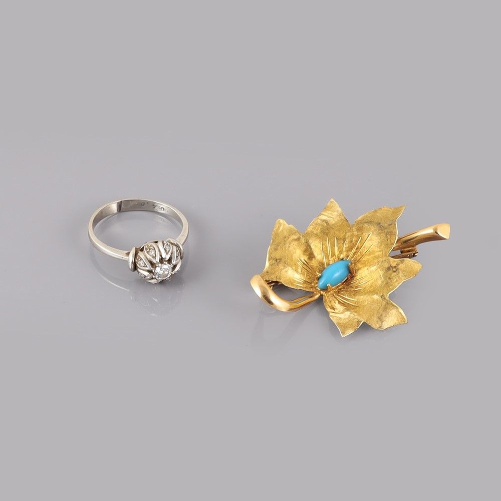rispettivamente in oro giallo a guisa di foglia con turchese e in oro bianco con brillante e piccoli diamanti a contorno, gr. complessivi 7,5. Misura anello 10