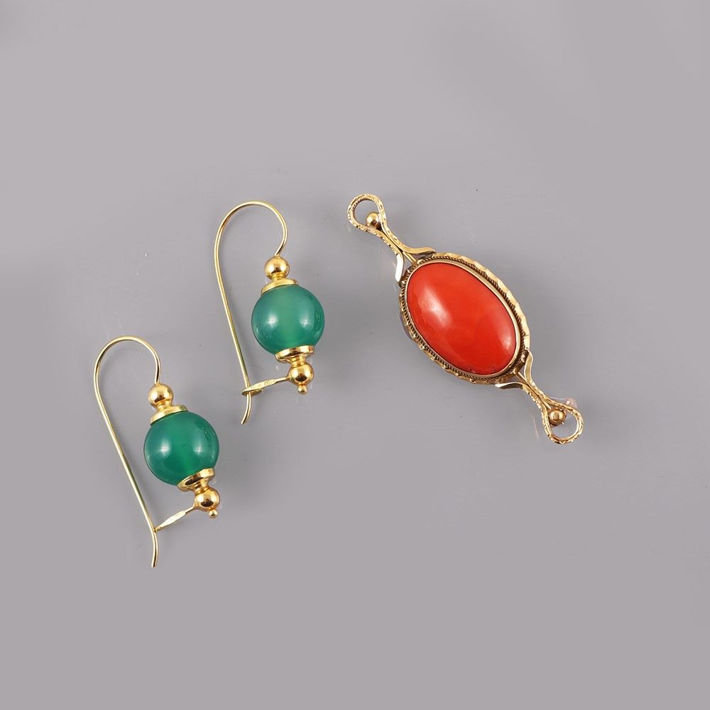 in oro giallo, rispettivamente a barretta con corallo ovale taglio cabochon e a monachella con sfere in crisoprasio, gr. complessivi 14,8. Lunghezza spilla 5,5 cm ca.
