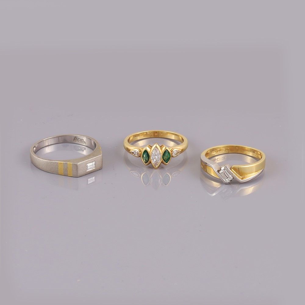 rispettivamente a fascia squadrata in platino e oro giallo con diamante baguette firmato Monile, in oro giallo con smeraldi e diamanti, in oro giallo e bianco con diamante baguette posto in diagonale, gr. complessivi 14,7. Misura 16,5 e 23