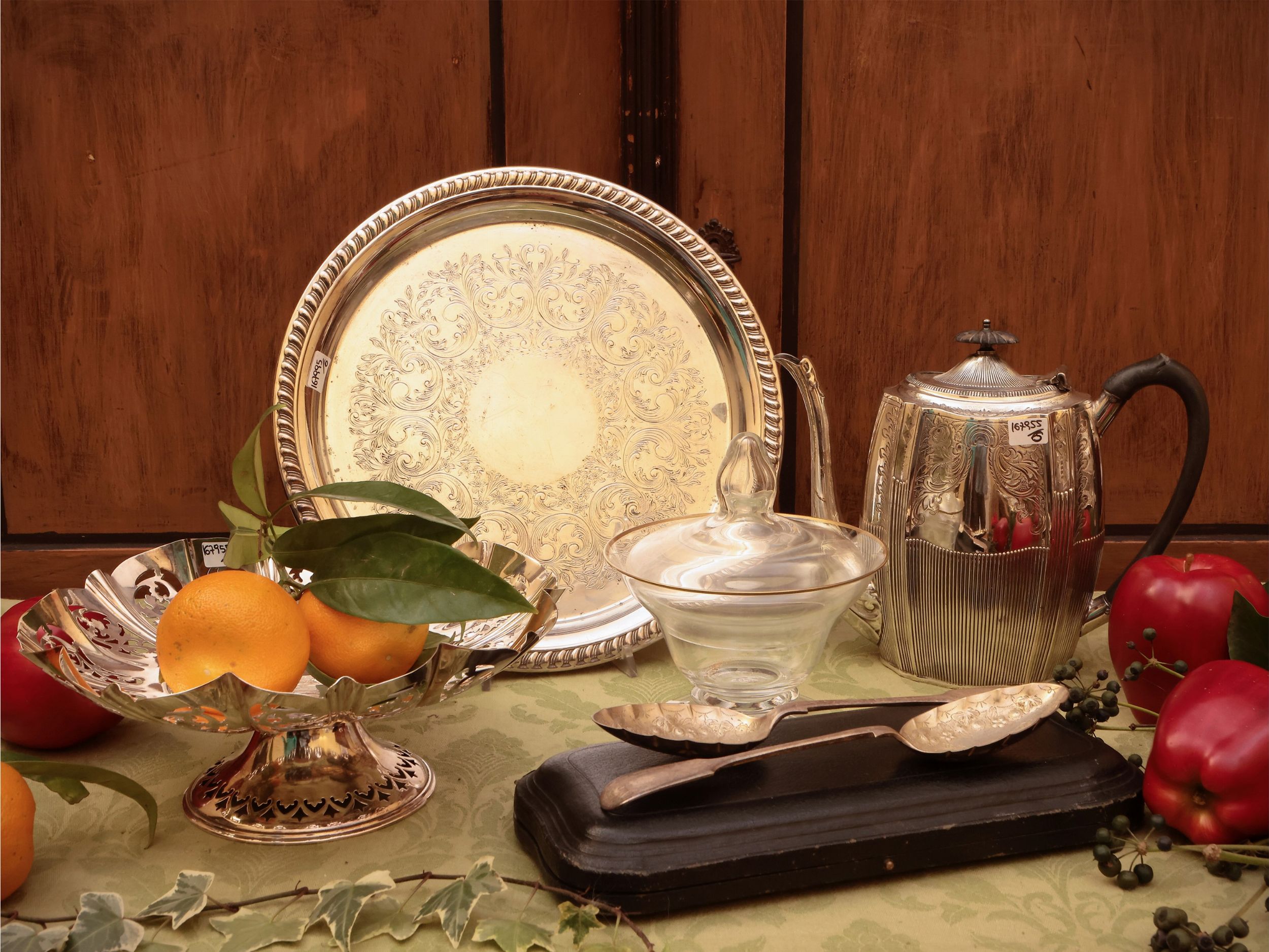 h da cm 5 a cm 20 (6) XIX/XX secolo tra cui una coppia di cucchiai da macedonia sbalzati con fiori, contenuti entro scatola originale, una alzata in porcellana francese dipinta con motivo di piccole rose, ed una alzata in metallo argentato traforata con motivo vegetale