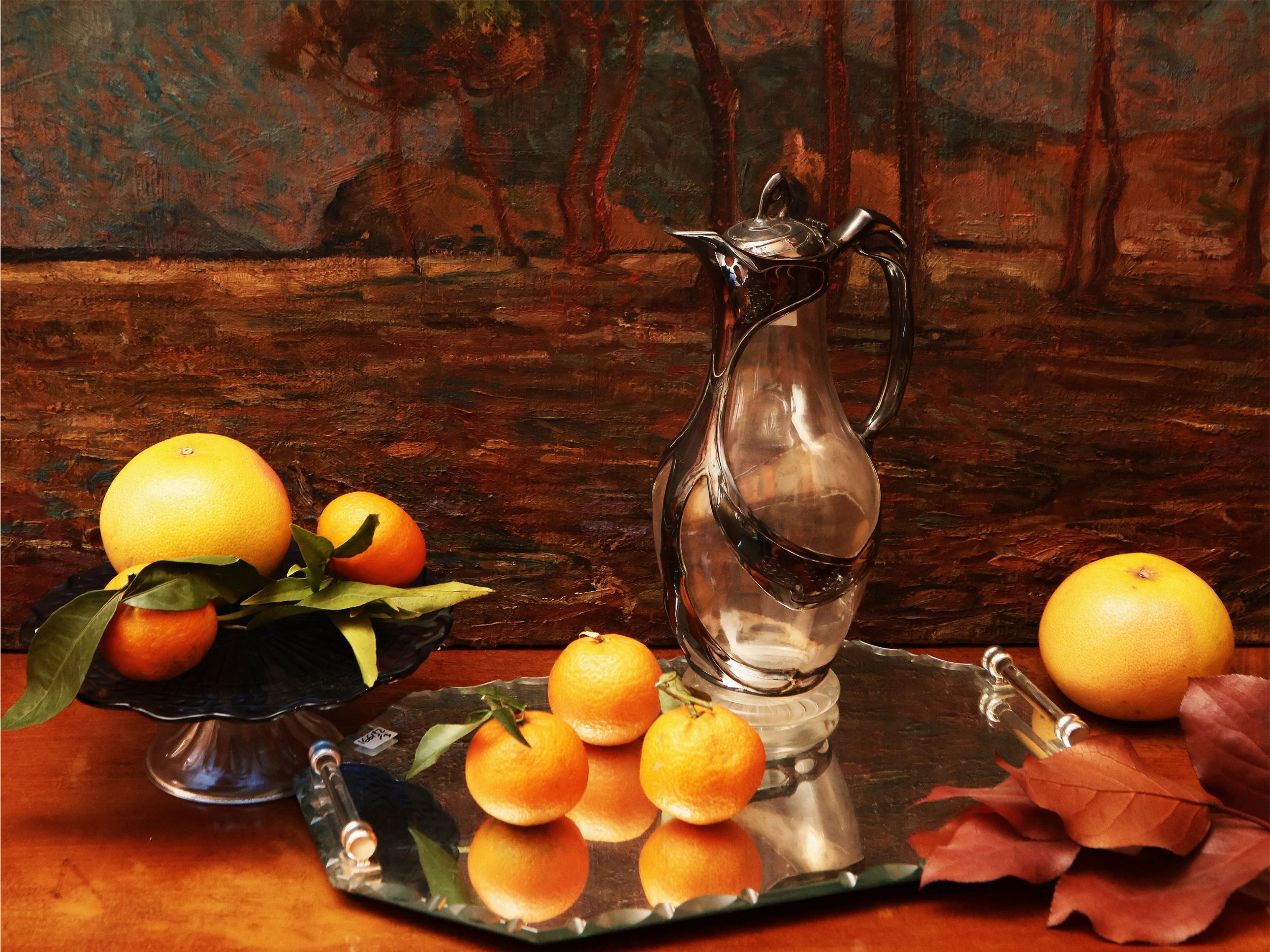 prima metà dle XX secolo un vassoio a specchio, una caraffa Art Nouveau rilegata in metallo argentato ed un'alzata in vetro pressato blu