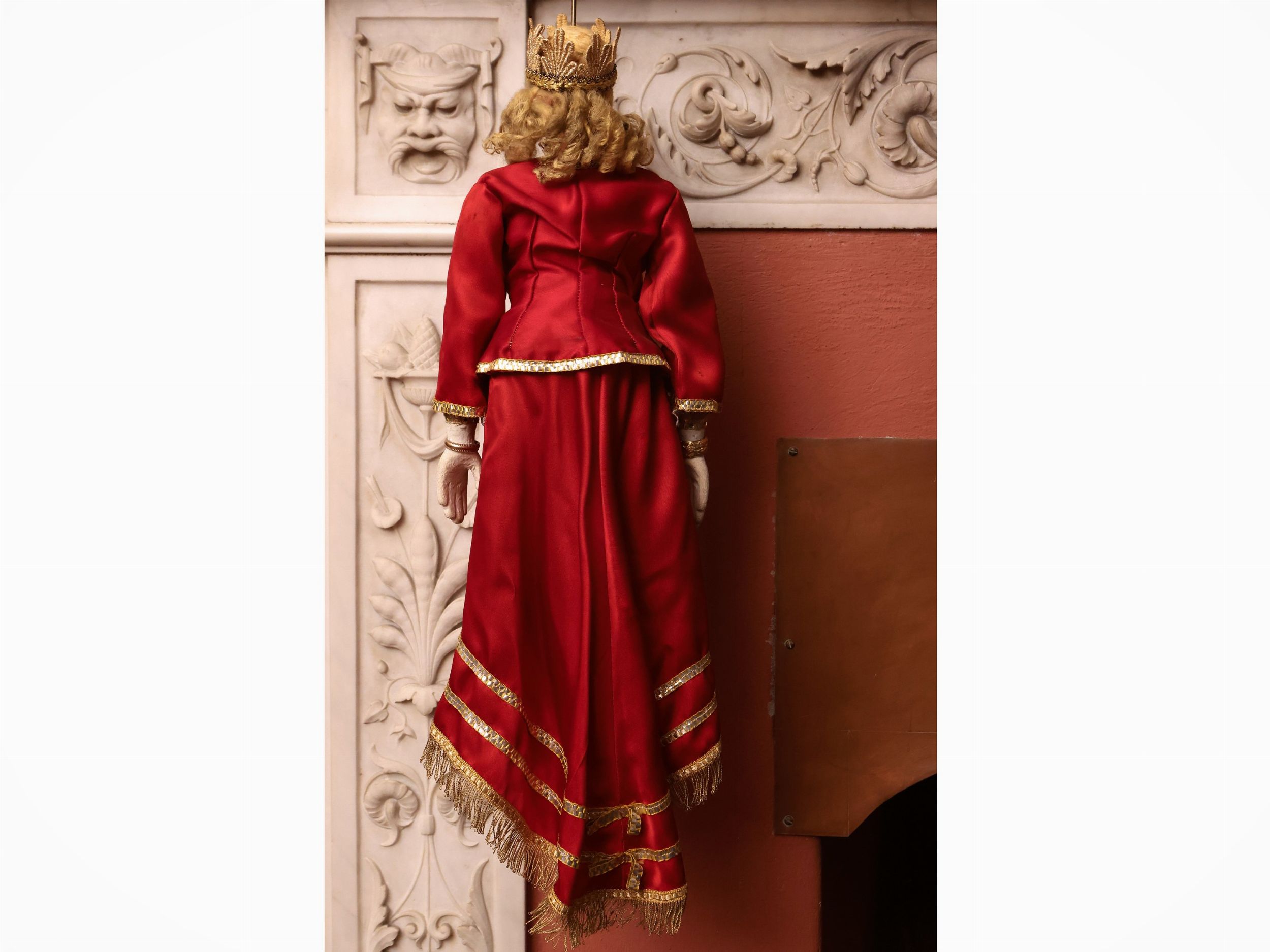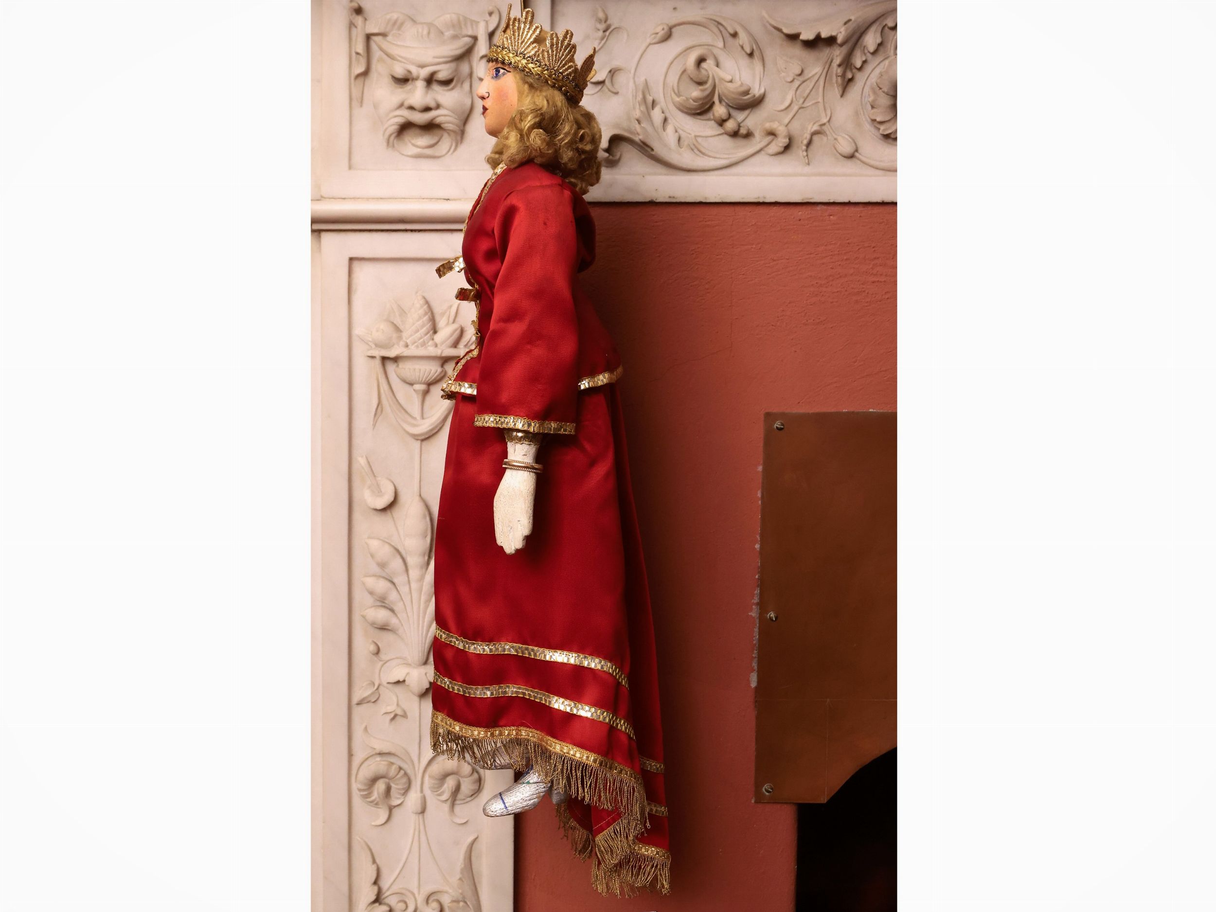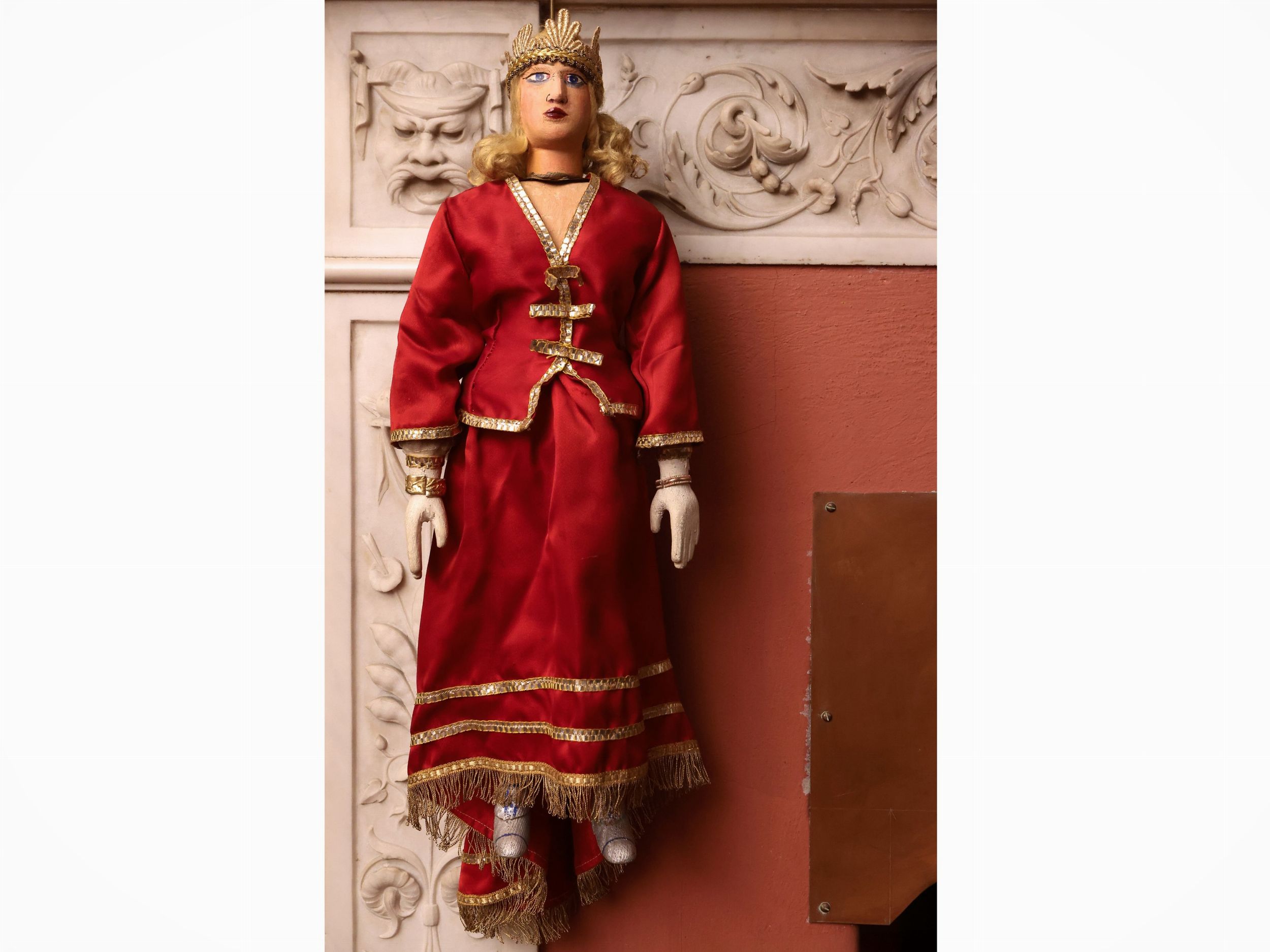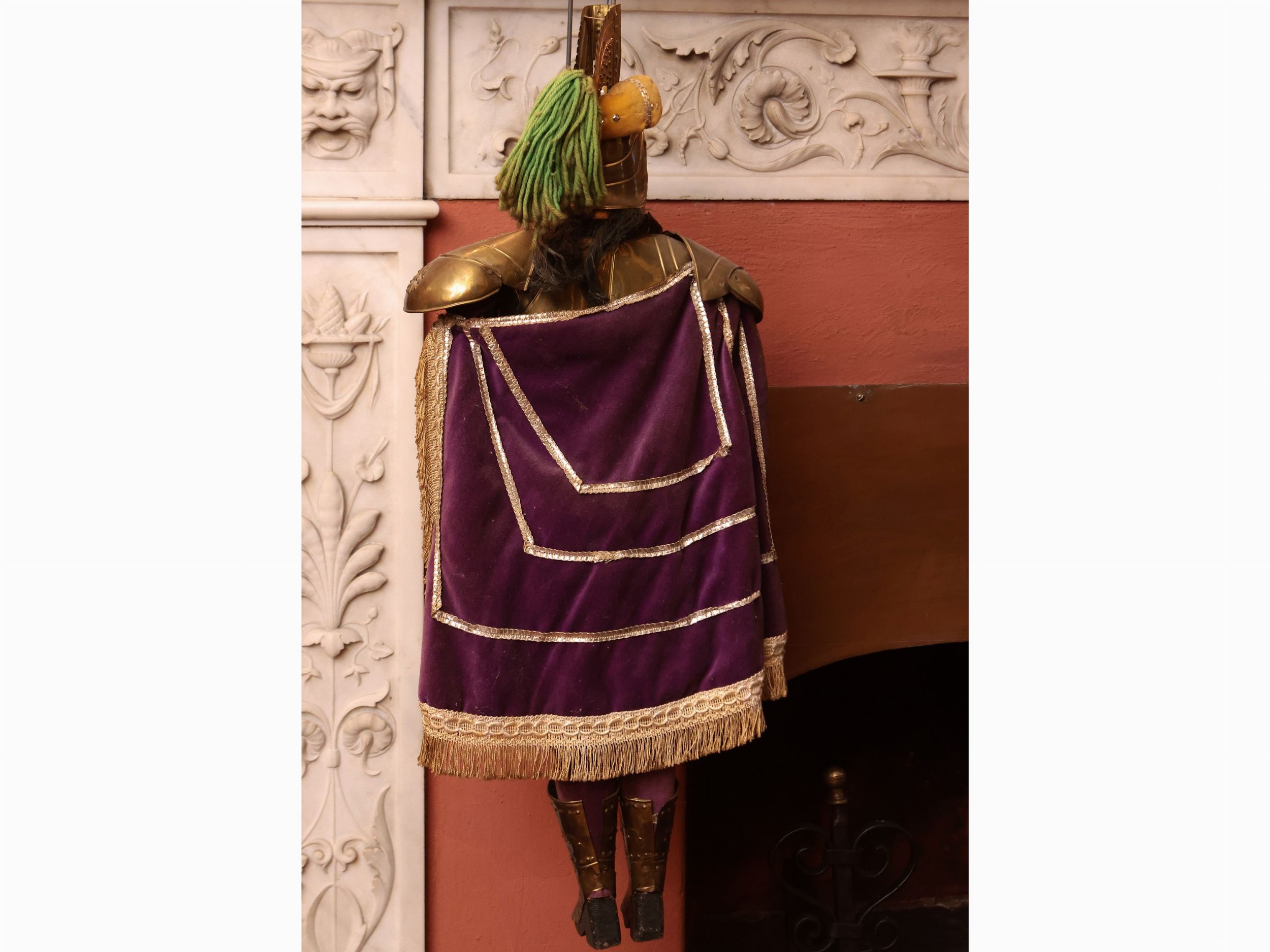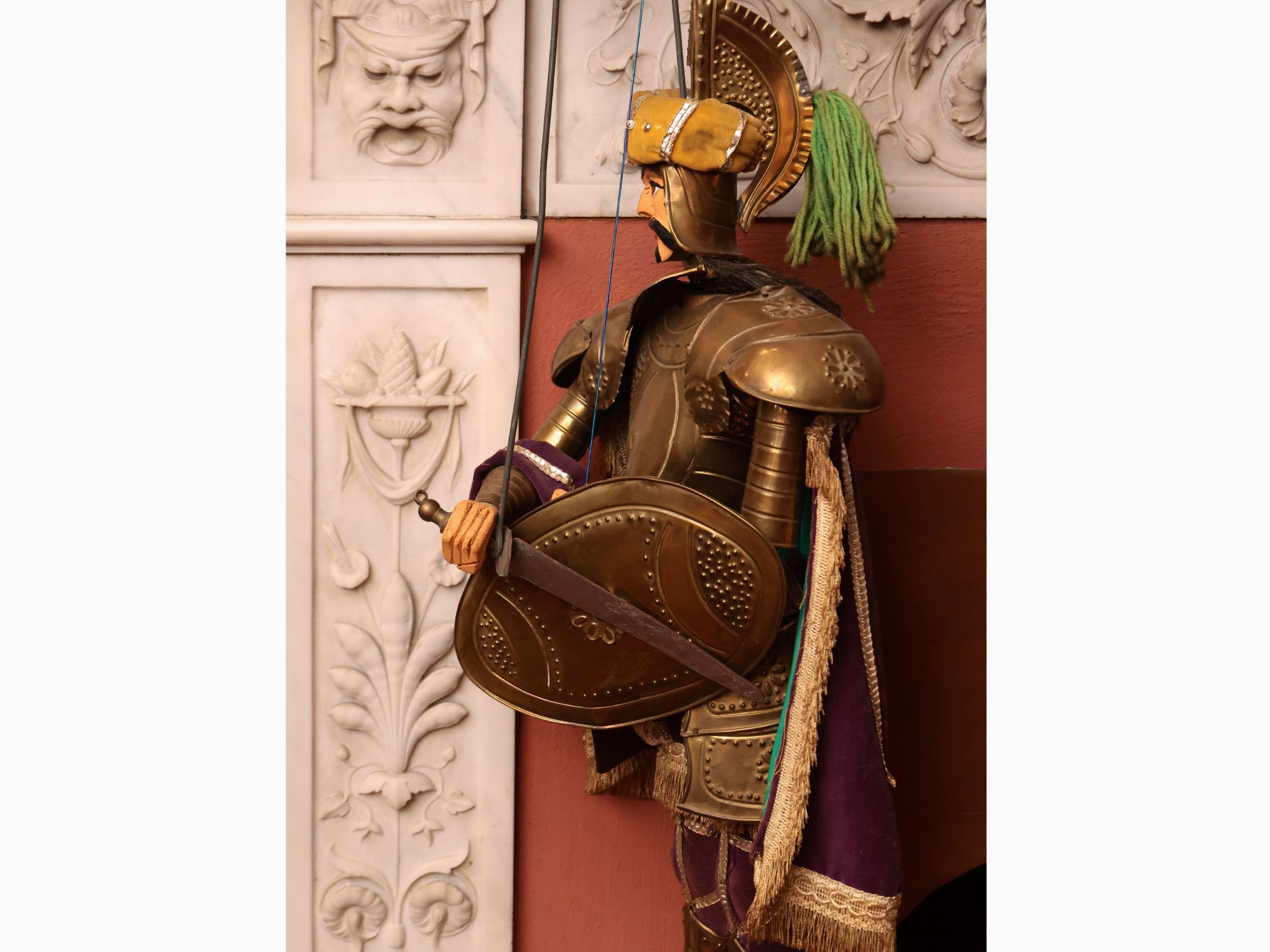 XX secolo due pupi siciliani in legno dipinto, abiti in varie tipologie di tessuti e latta