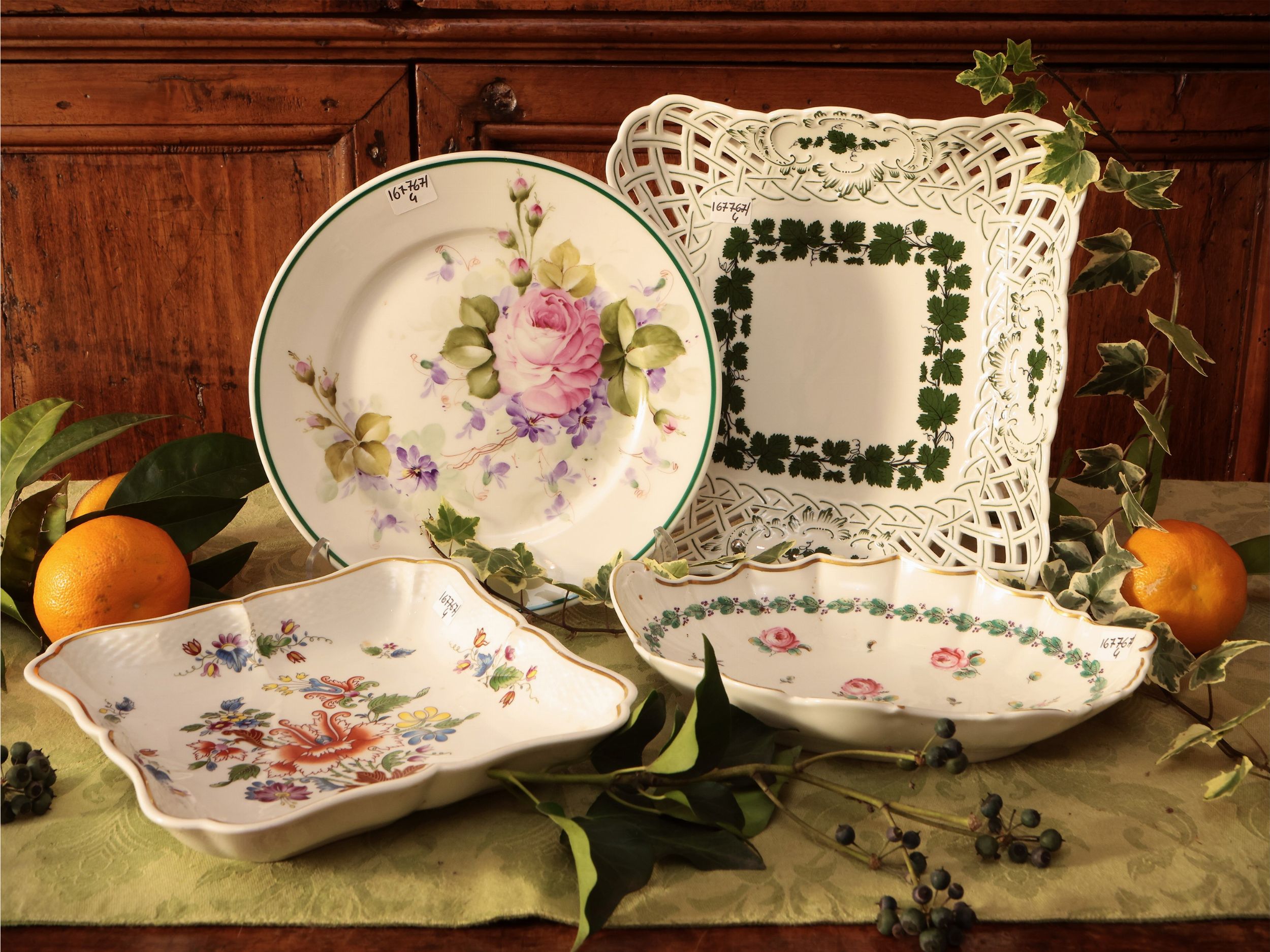 da cm 17,5x24 a cm 25x24 (4) XIX/XX secolo composto da un vassoio centrotavola Meissen, dipinto in monocromia verde con ghirlanda di foglie, due vassoietti ed un piatto Richard Ginori e Ginori, dipinti con motivi floreali