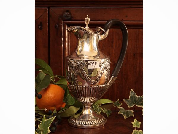 Londra, 1892 sbalzata con festoni, su base circolare baccellata, presa a pinnacolo e manico in legno ebanizzato