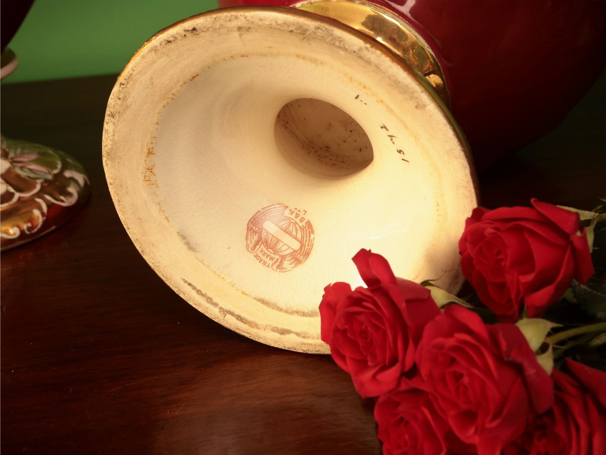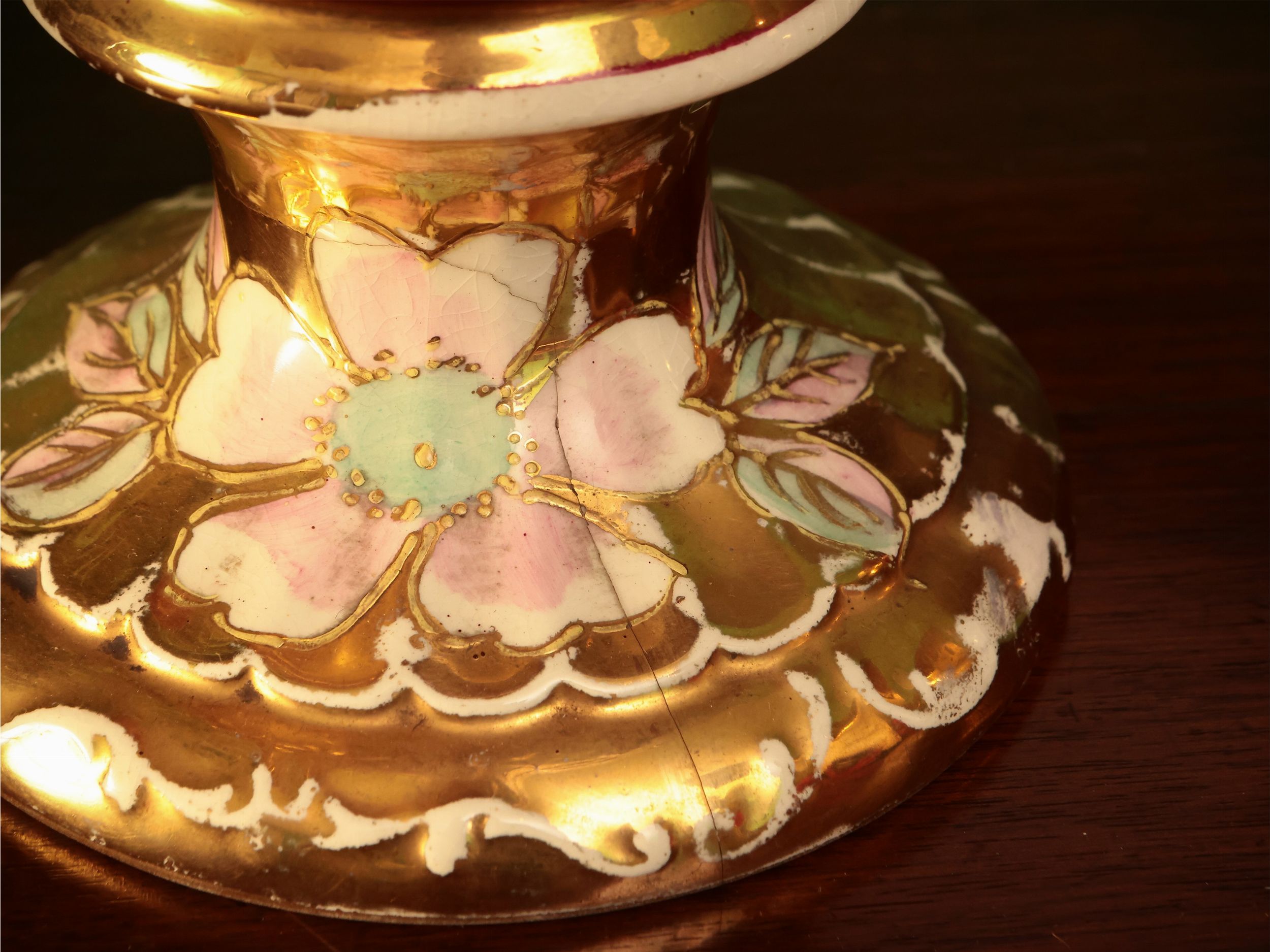 seconda metà del XIX secolo dipinti in policromia con figure allegoriche entro riserve circolari lumeggiate in oro con tralci floreali su fondo magenta, bordo mosso e prese laterali a voluta, lievi difetti