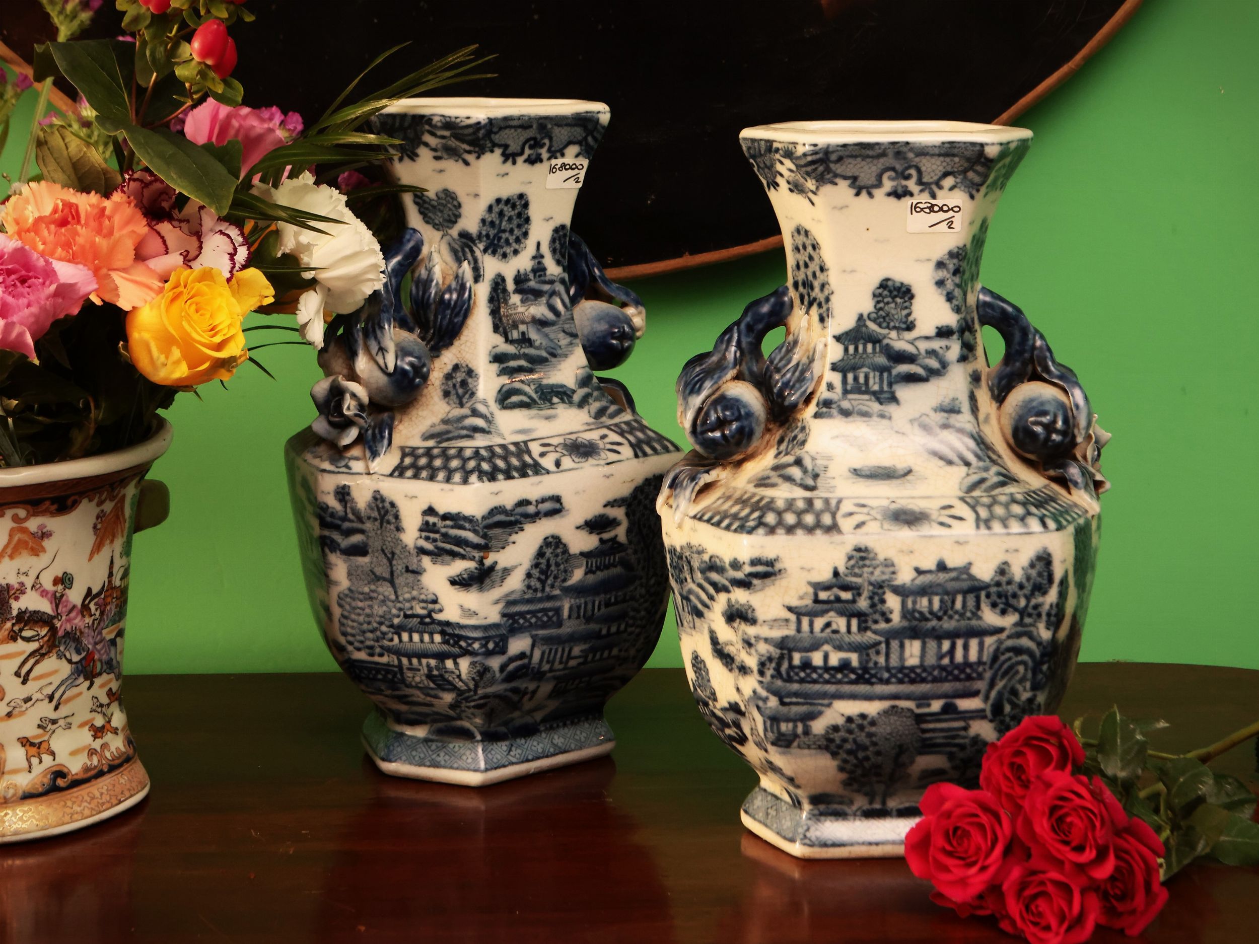 probabilmente Inghilterra, XIX/XX secolo dipinti in monocromia blu con paesaggi a chinoserie, prese laterali modellate come frutti