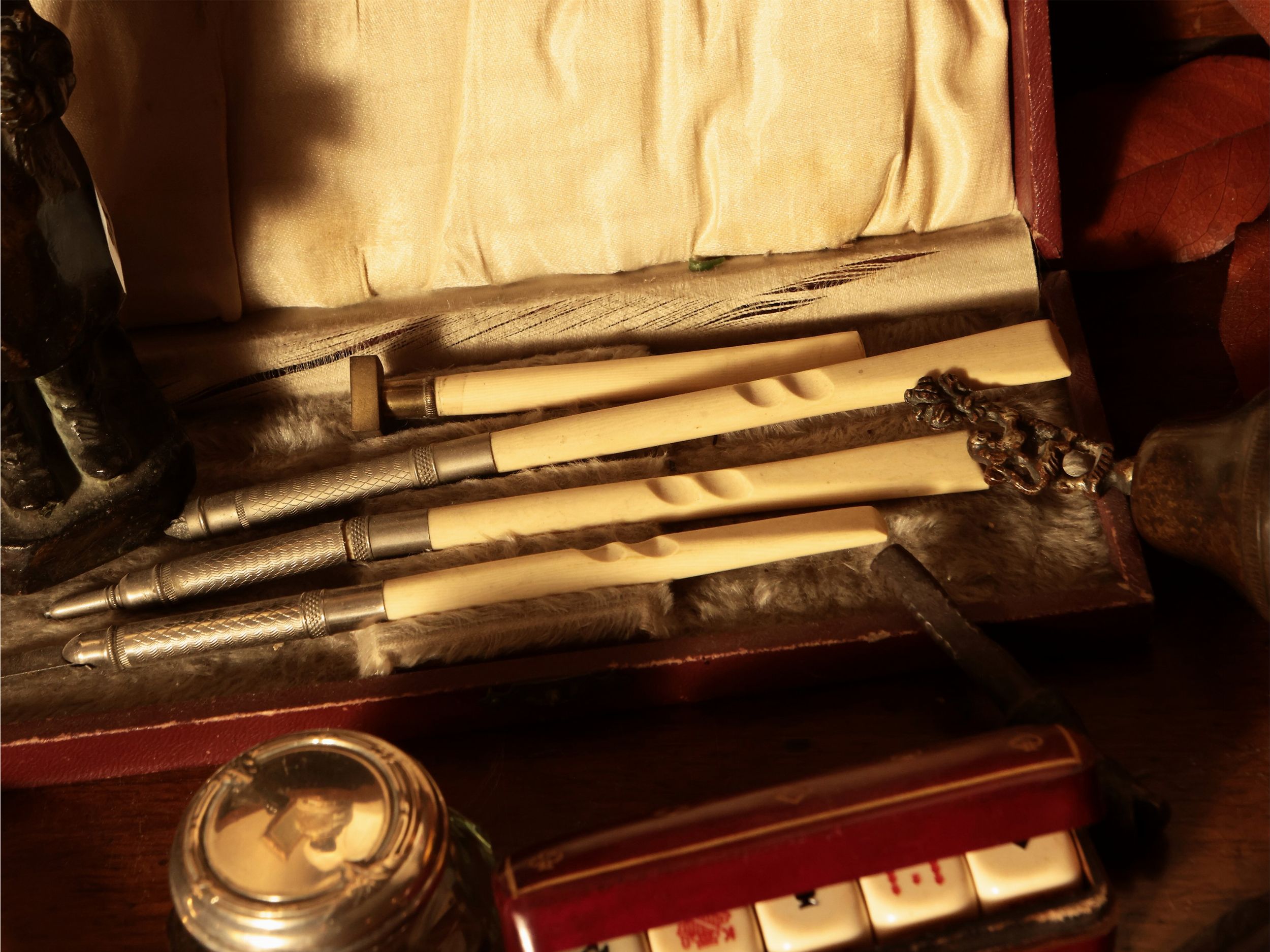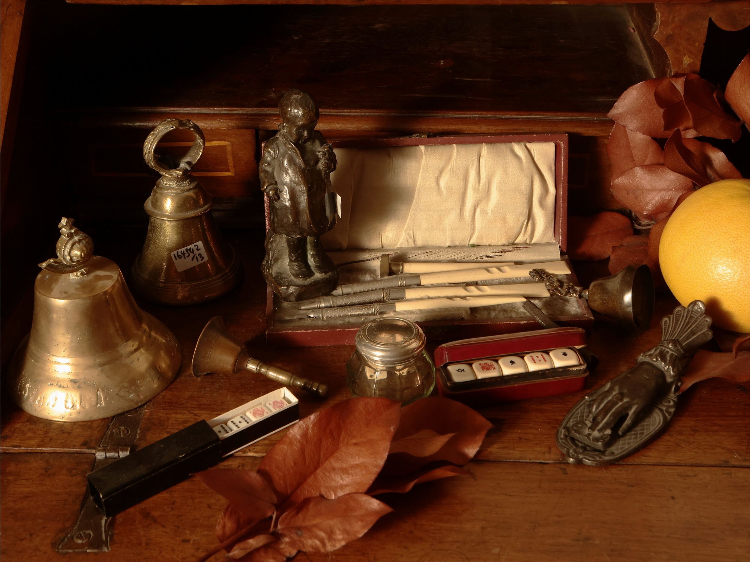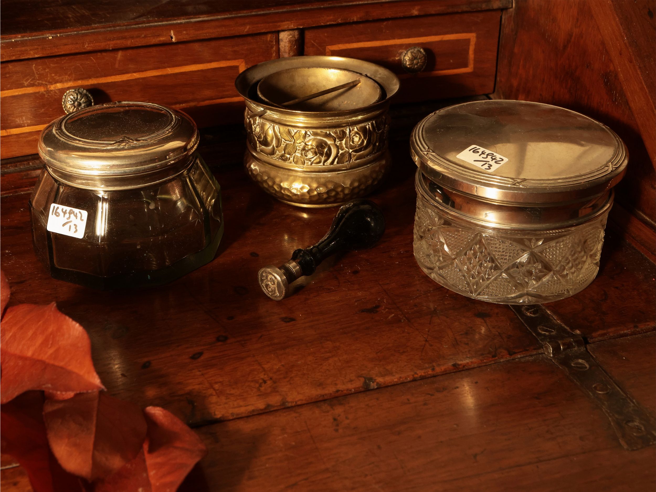 inizio del XX secolo tra cui una piccola scultura in bronzo raffigurante un bambino, due scatole in vetro con coperchio in argento ed alcune campane e campanelli