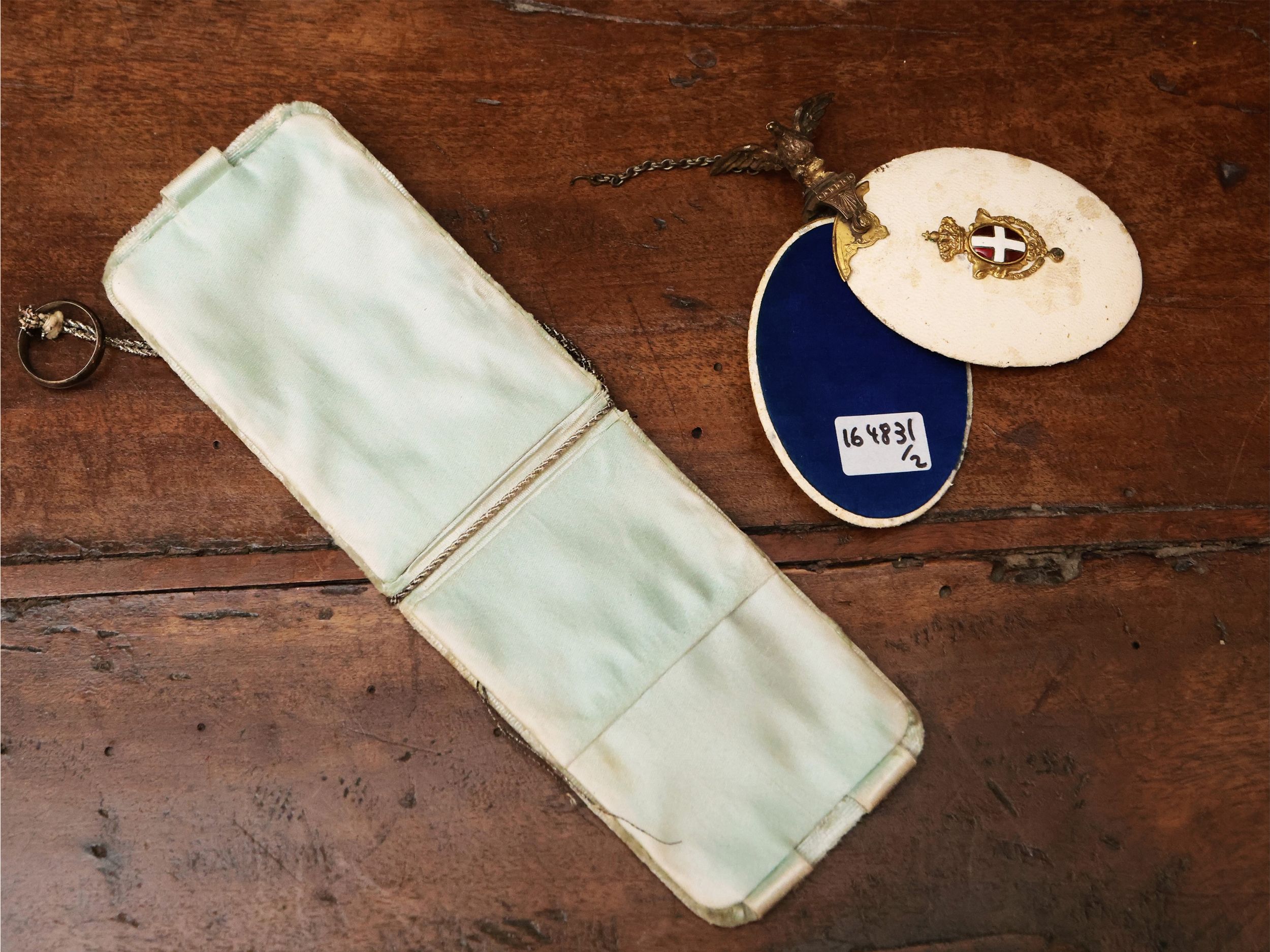 XIX/XX secolo uno rivestito in velluto verde chiaro centrato da stemma Savoia con aquila, l'altro di forma ovale, rivestito in pelle bianca con stemma Savoia in smalti, con presa a foggia di aquila ad ali spiegate, alcuni difetti