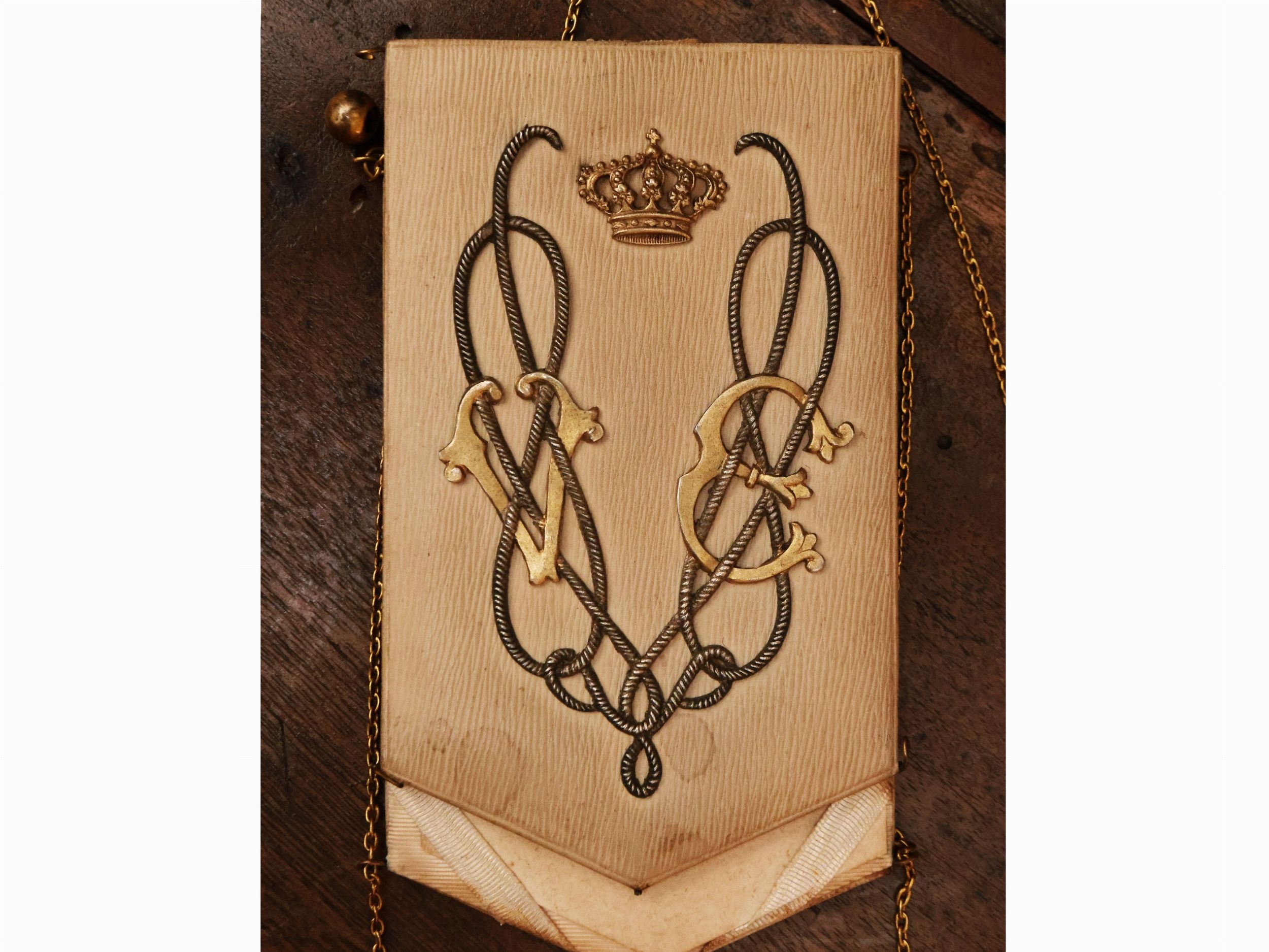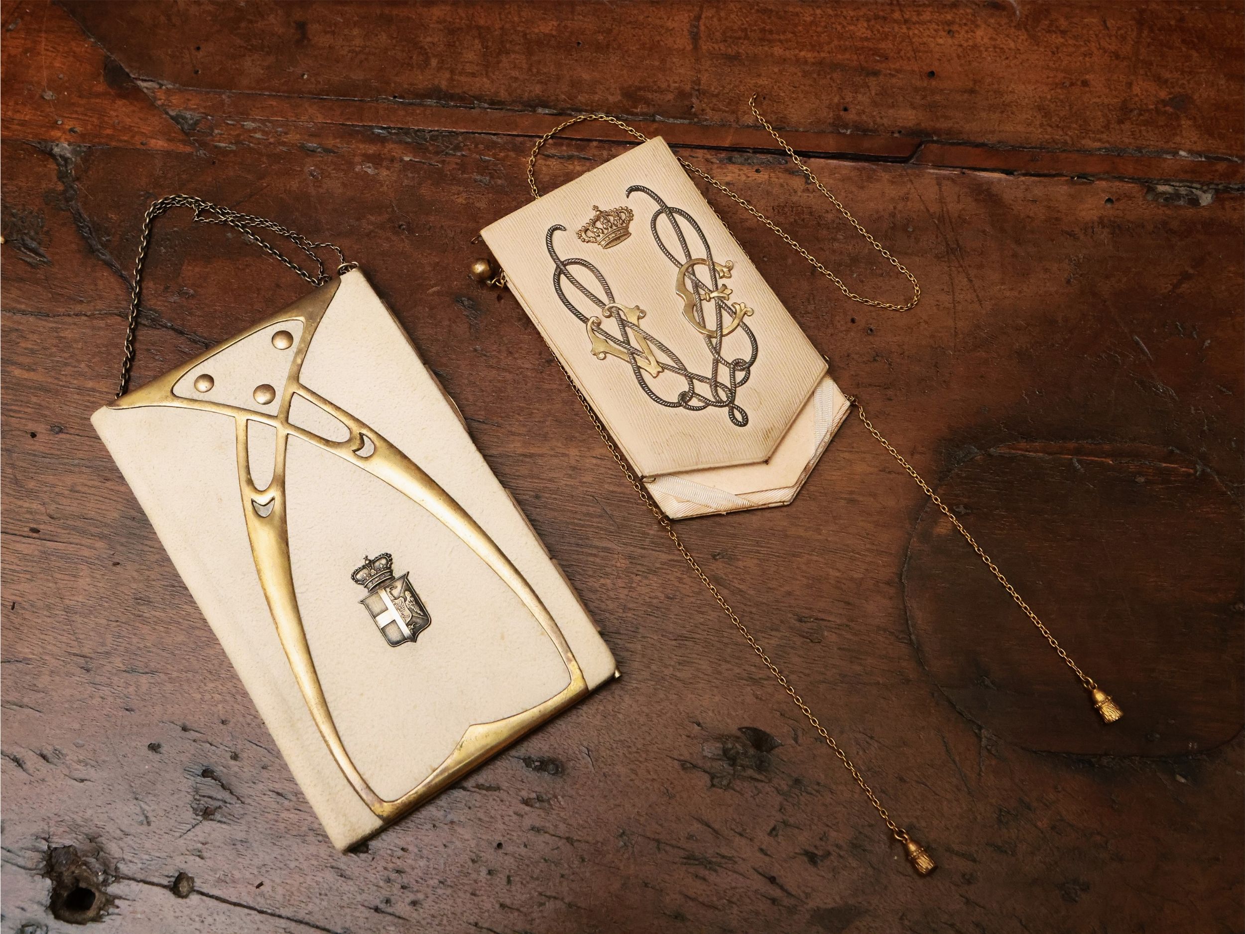 inizio del XX secolo uno in pelle con le iniziali VE tra nodi Savoia in metalli ed uno in panno con applicazioni di gusto Art Nouveau, alcuni difetti