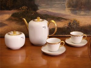 h da cm 10 a cm 15 (14) bordo profilato e decorato con piccoli motivi floreali in oro, composto da teiera, zuccheriera [..]