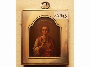 cm 9x7 Russia, 1896-1908 piccola icona per devozione privata, tempera su tavola (lievi difetti), entro cornice [..]