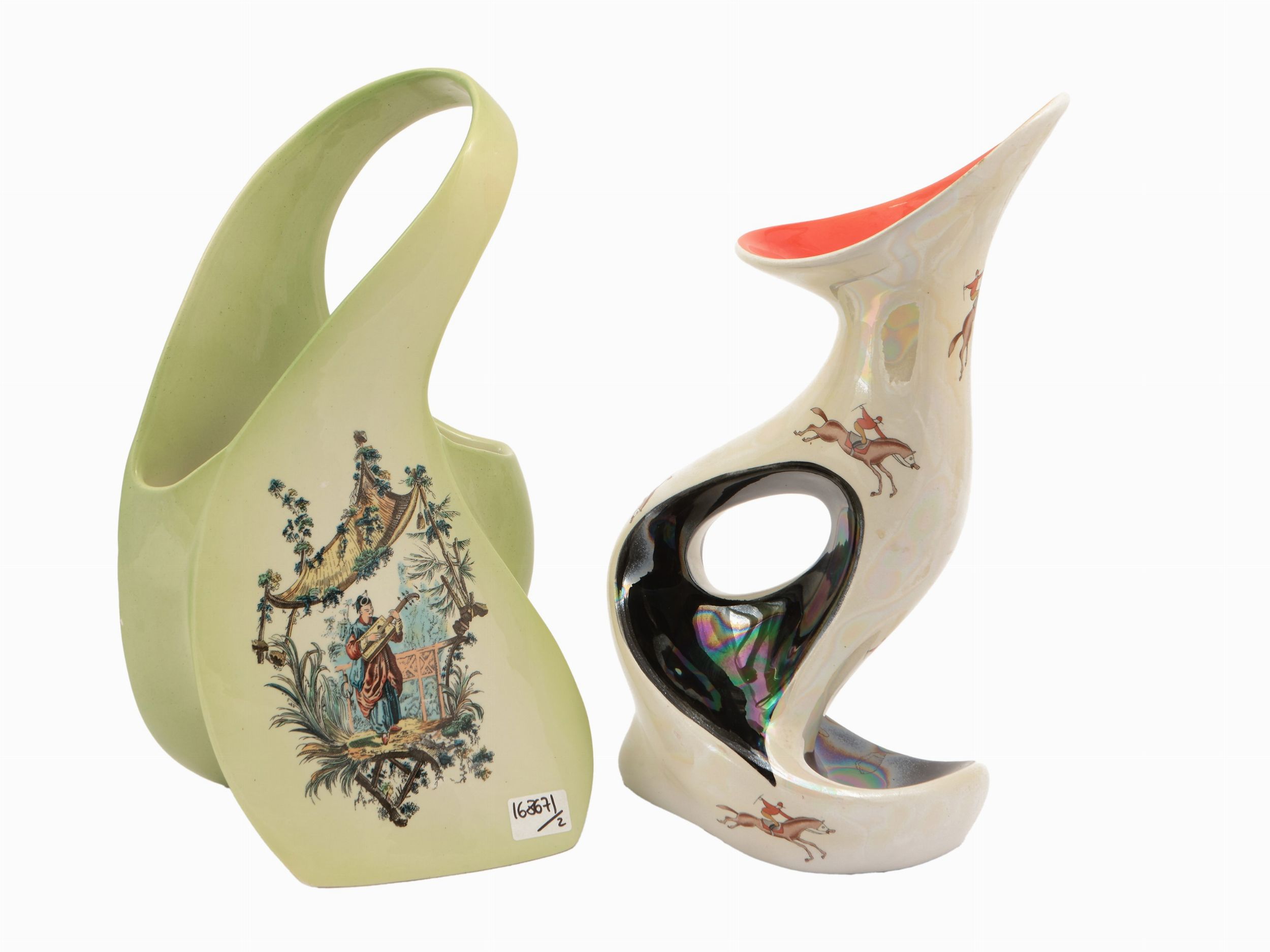 Anni Cinquanta di forma sagomata, uno decorato con cavalli su fondo avorio smaltato a lustro, l'altro nei toni del verde decorato con soggetto orientale