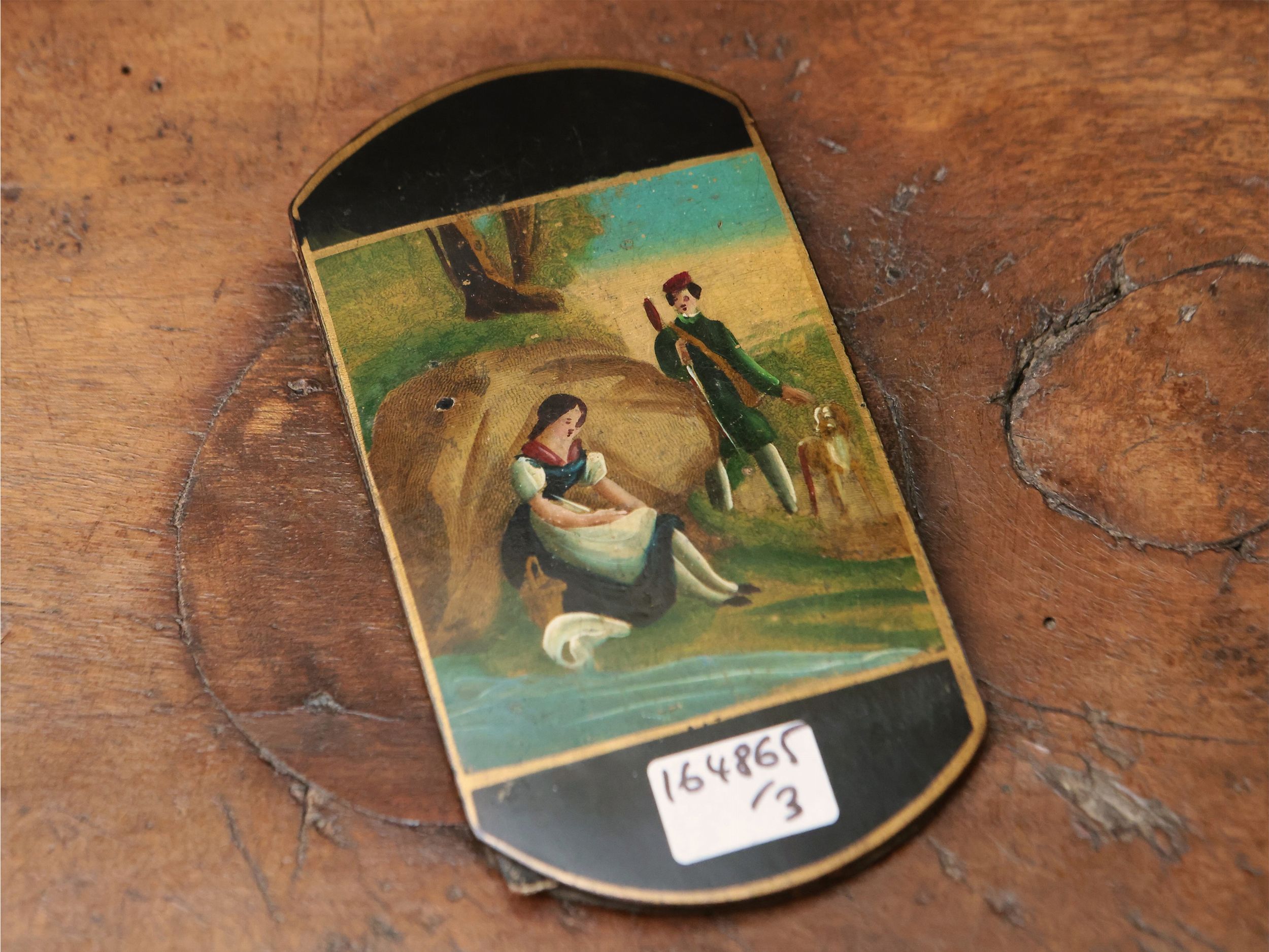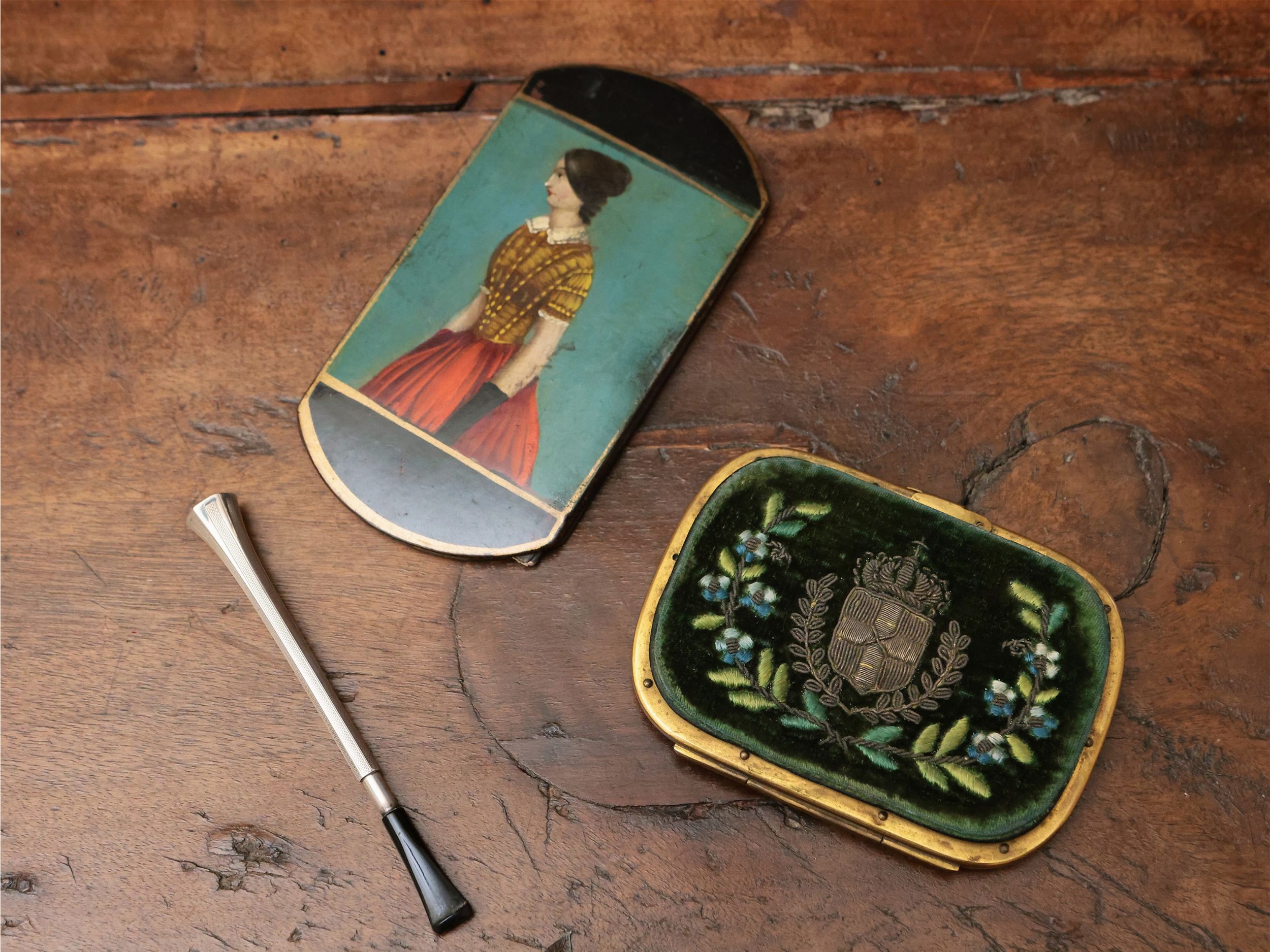 inizio del XX secolo un borsellino in velluto verde con stemma Savoia ricamato, Forti Firenze, una custodia per occhiali in lacca dipinta con figura femminile ed un bocchino in argento