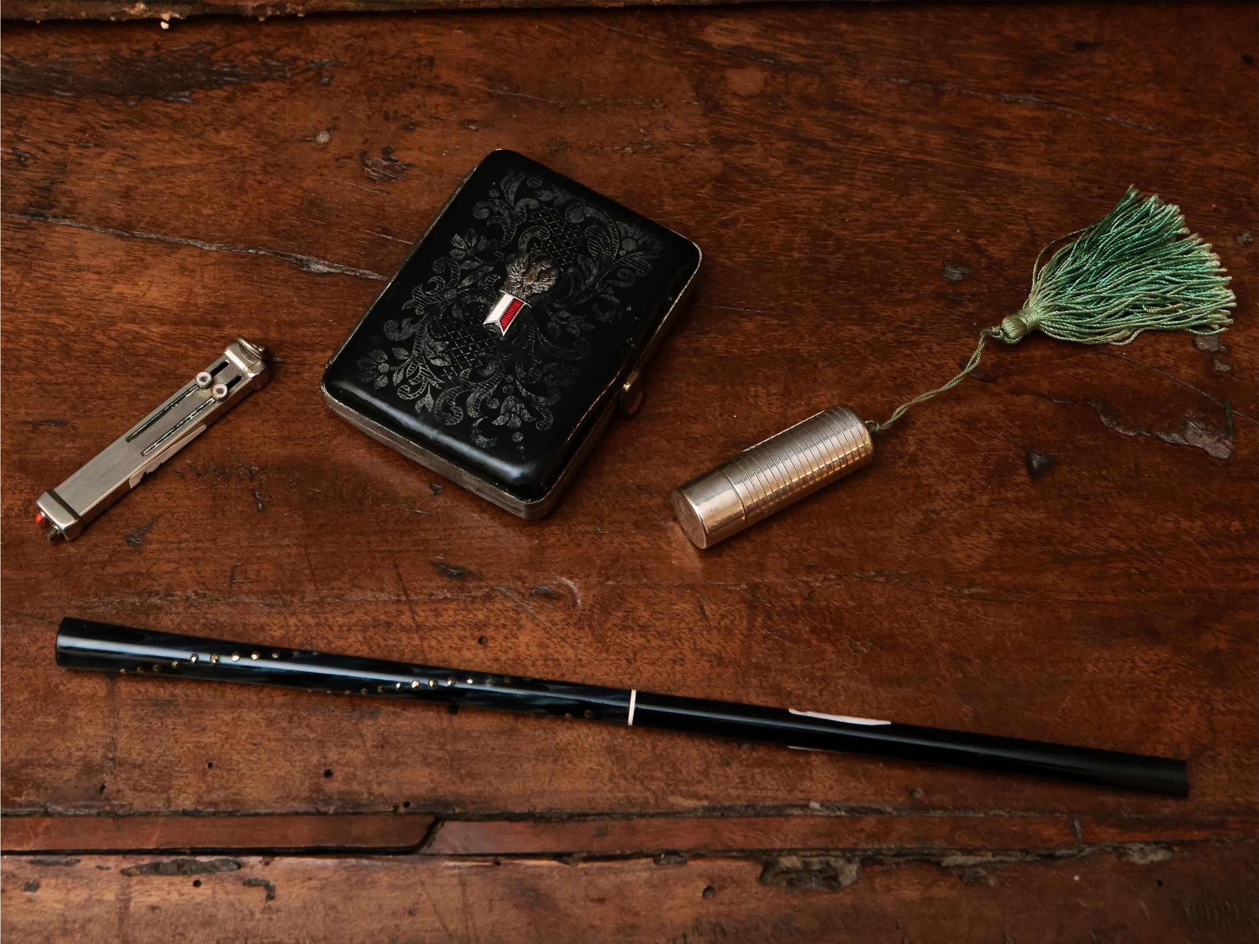 astuccio cm 8x6,5 (4) inizio del XX secolo un astuccio in pelle e metallo con stemma della Polonia in smalti, una doppia matita, un lungo bocchino in bachelite e marcassiti ed un piccolo astuccio cilindrico in argento contenente accessori per la manicure, alcuni difetti