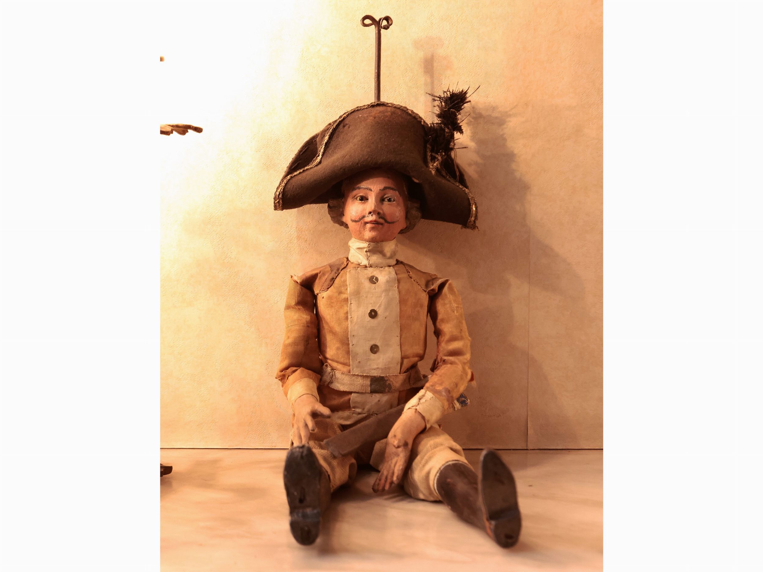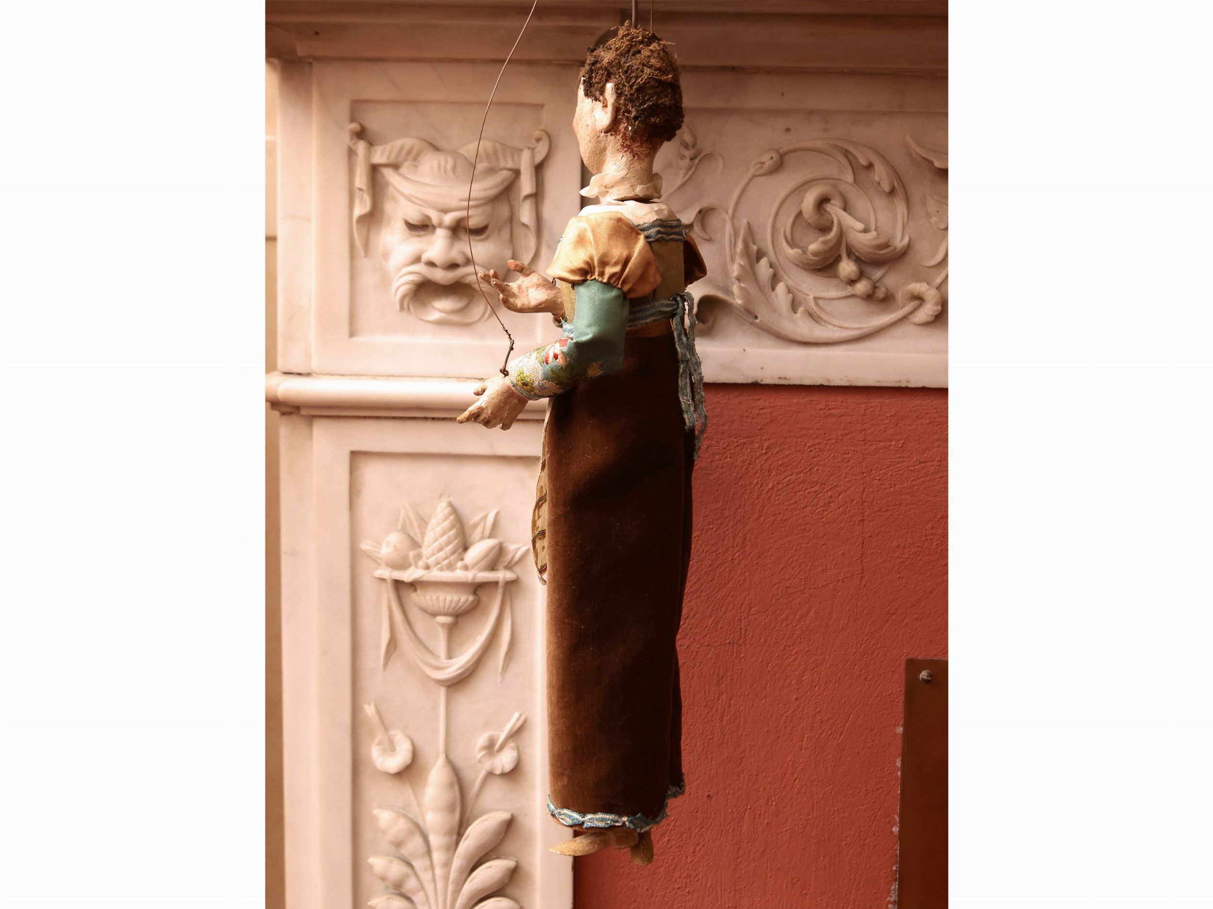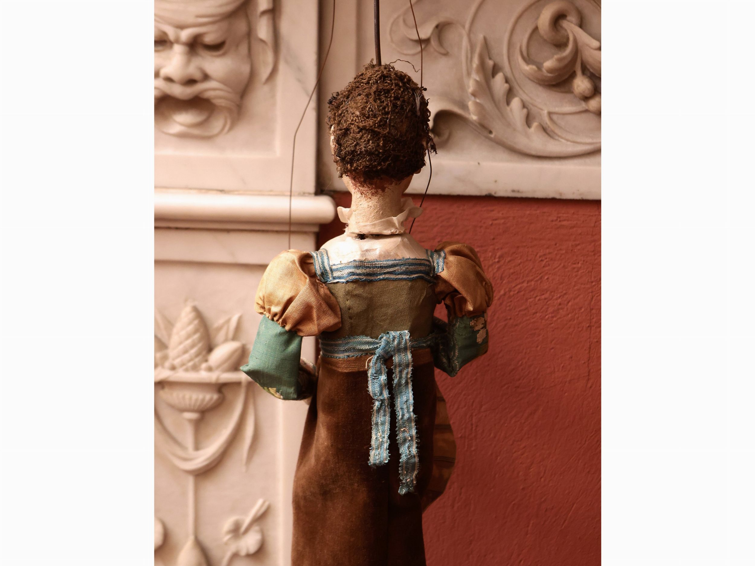 h cm 40 circa XIX secolo due marionette in legno dipinto, il personaggio maschile con ampia feluca in panno marrone, occhi in vetro, abiti in varie tipologie di tessuti nei toni del beige; il personaggio femminile con occhi in vetro, capelli naturali (difetti), abito in stile impero realizzato in varie tipologie di tessuti e velluto nei toni del marrone, entrambi con difetti e alcune mancanze