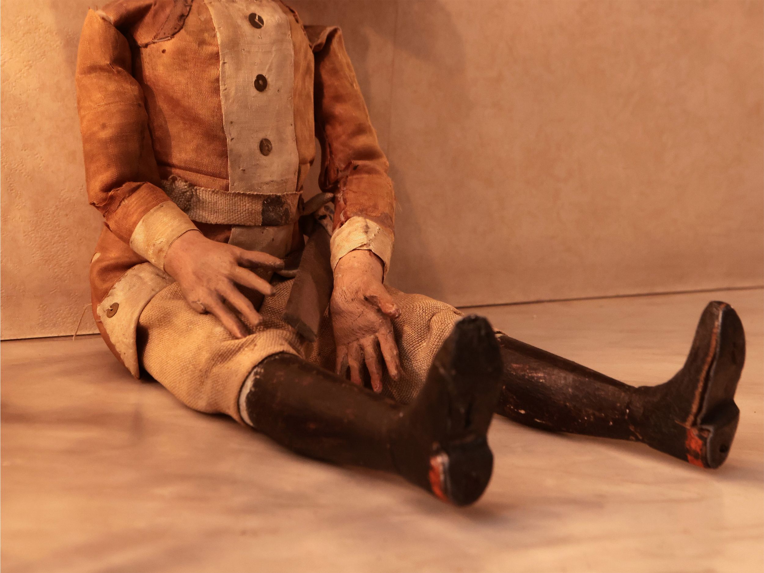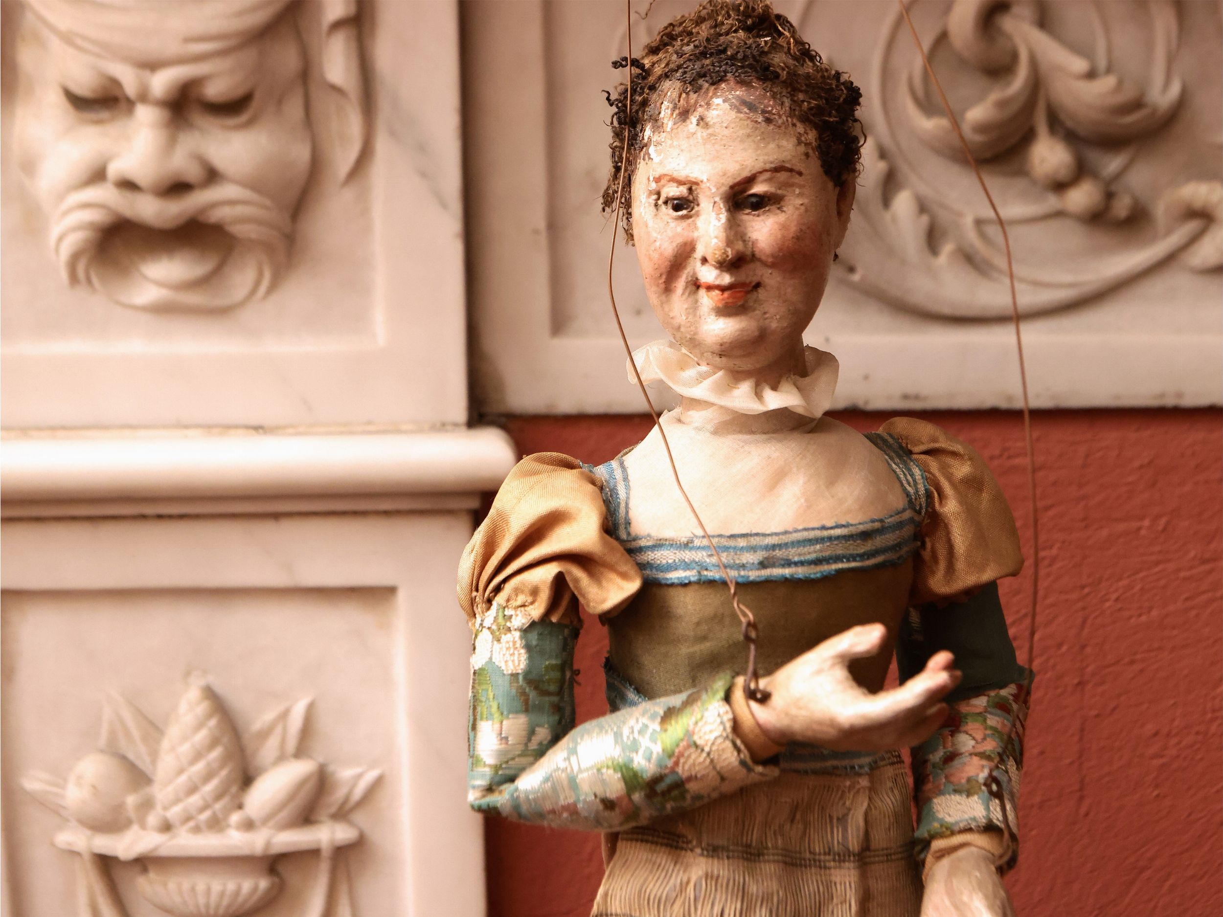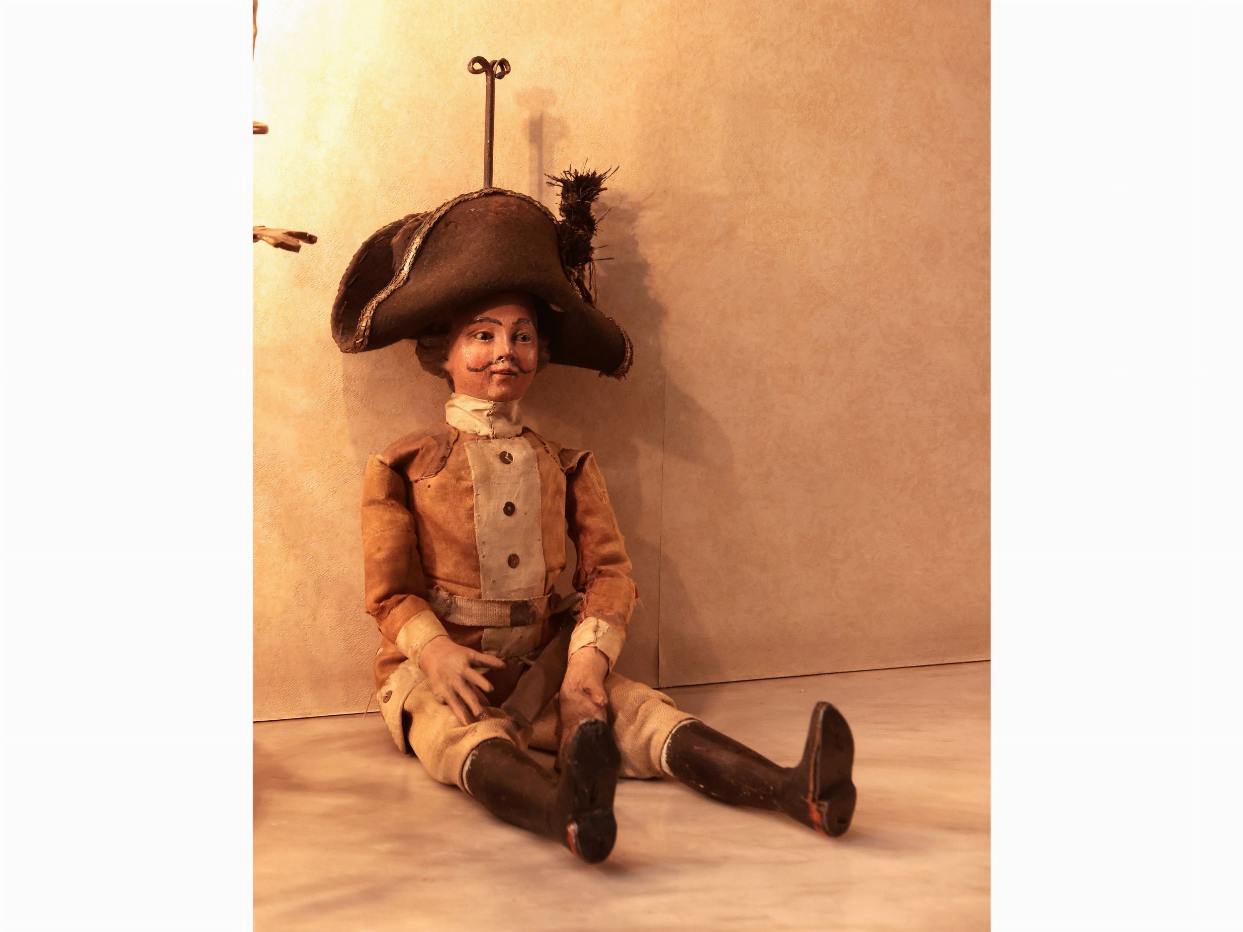 h cm 40 circa XIX secolo due marionette in legno dipinto, il personaggio maschile con ampia feluca in panno marrone, occhi in vetro, abiti in varie tipologie di tessuti nei toni del beige; il personaggio femminile con occhi in vetro, capelli naturali (difetti), abito in stile impero realizzato in varie tipologie di tessuti e velluto nei toni del marrone, entrambi con difetti e alcune mancanze