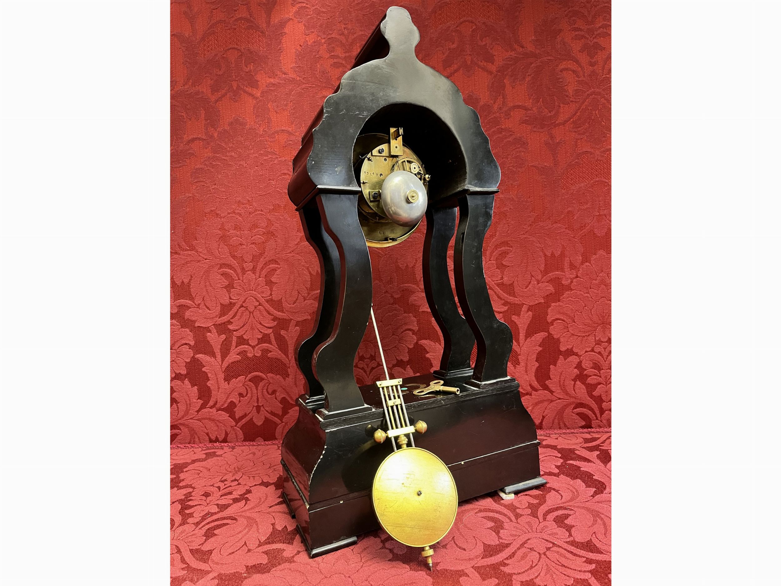 h cm 59x28x10 Francia, XIX secolo cimasa sormontata da pinnacolo, dipinto in policromia con fiori e girali e lumeggiature dorate, quadrante in smalto con numeri romani, base a plinto, corredato da pendolo, contenuto entro campana coeva con base in legno