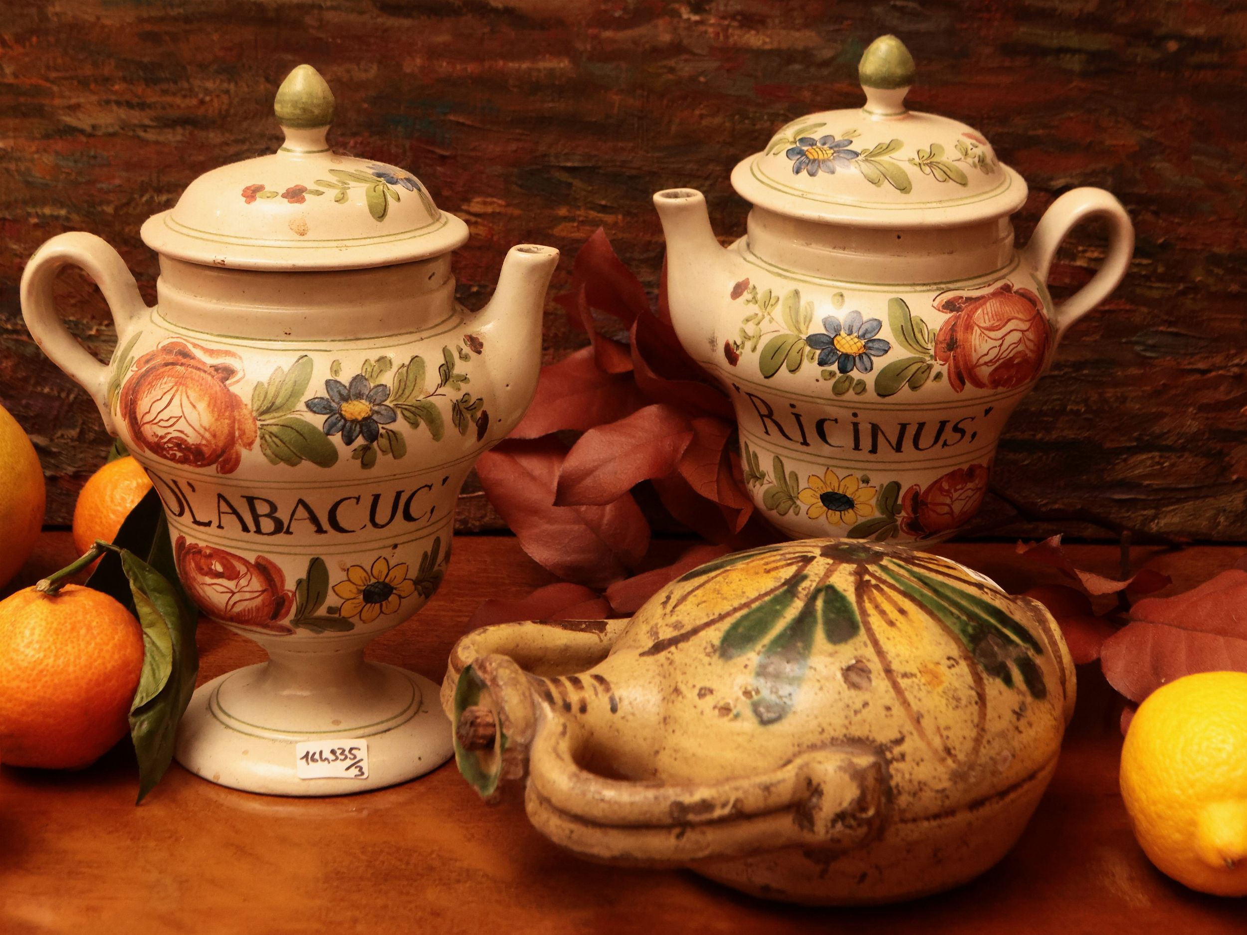 XIX secolo composto da una coppia di piccoli versatoi da farmacia dipinti con motivi floreali ed una piccola fiasca popolare