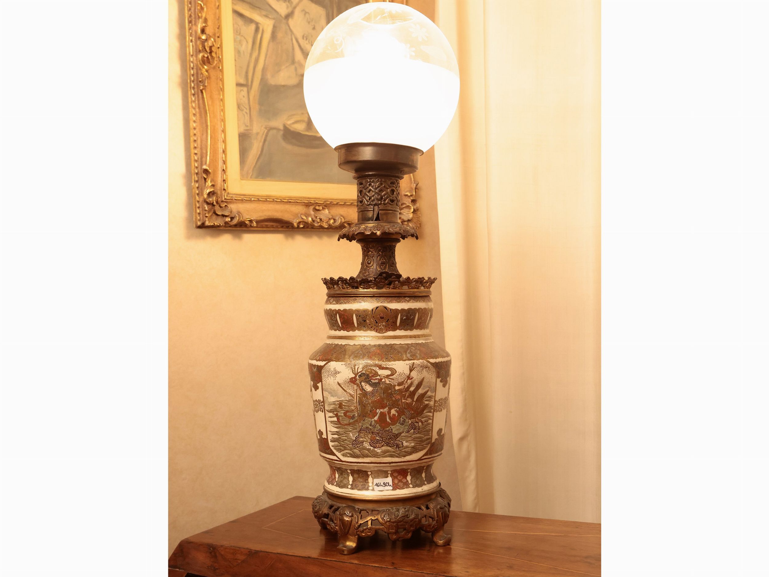 Giappone, fine del XIX/inizio del XX secolo realizzato con un vaso, decorato con divinità su tartaruga nei toni dell'oro, dell'arancio e del verde acqua, rilegato in metallo, bobeche in vetro, elettrificato