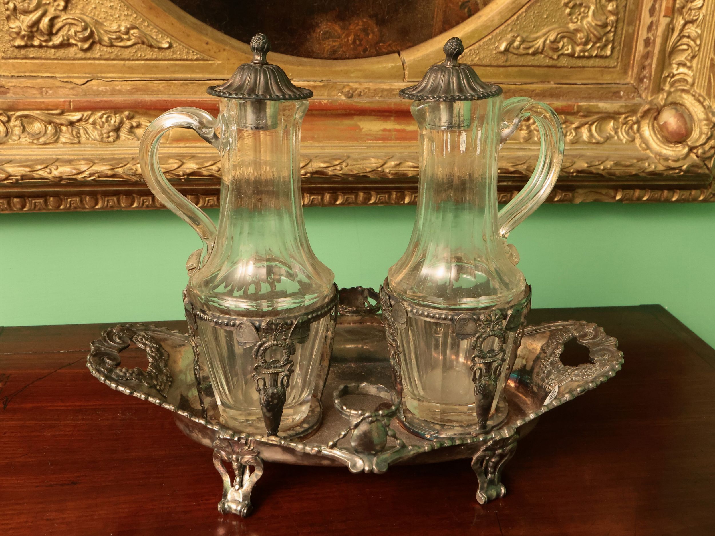 realizzata a navicella con prese laterali cesellate con foglie di vite e grappoli d'uva, due portampolle a cestino traforate con motivo a vaso, due ampolle in vetro molato con tappi in argento