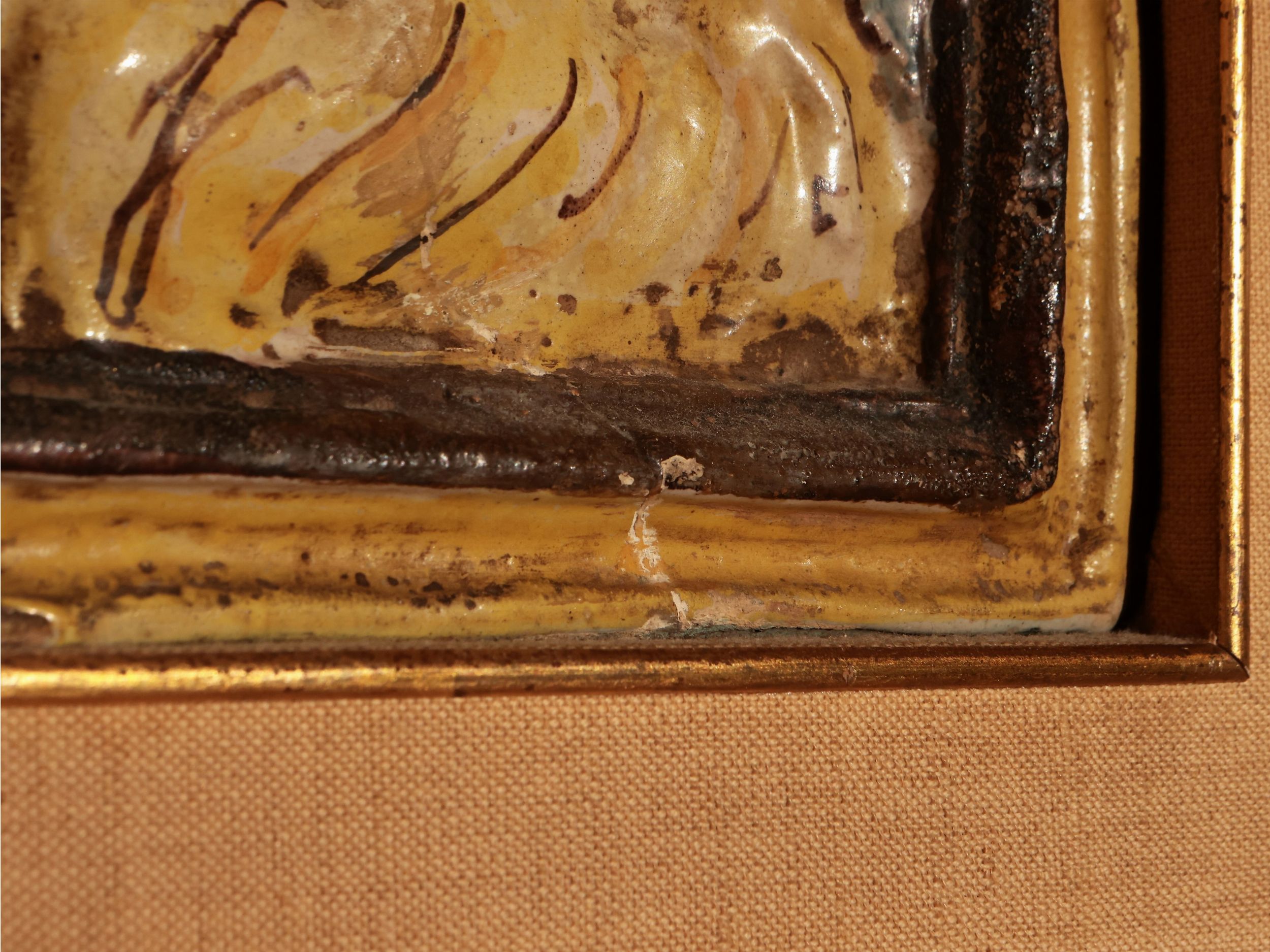 Italia centrale, XVIII secolo placca in maiolica policroma, in cornice
