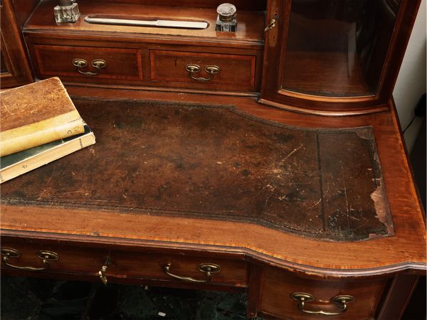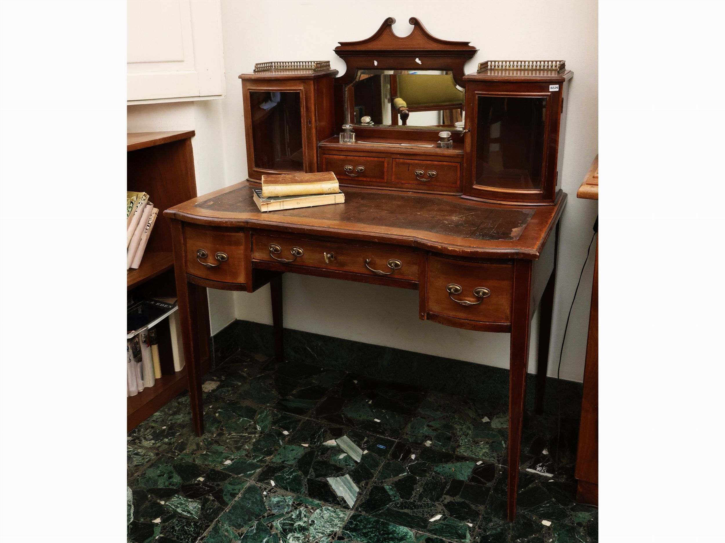 h cm 104x100x51 inizio del XX secolo intarsiato con filettature, piccola specchiera centrale con due cassettini sottostanti, due vetrinette laterali per ninnoli e galanterie, piano scrittoio sagomato in parte rivestito in cuoio impresso marrone, tre cassetti nella fascia, gambe a faretra, alcuni difetti