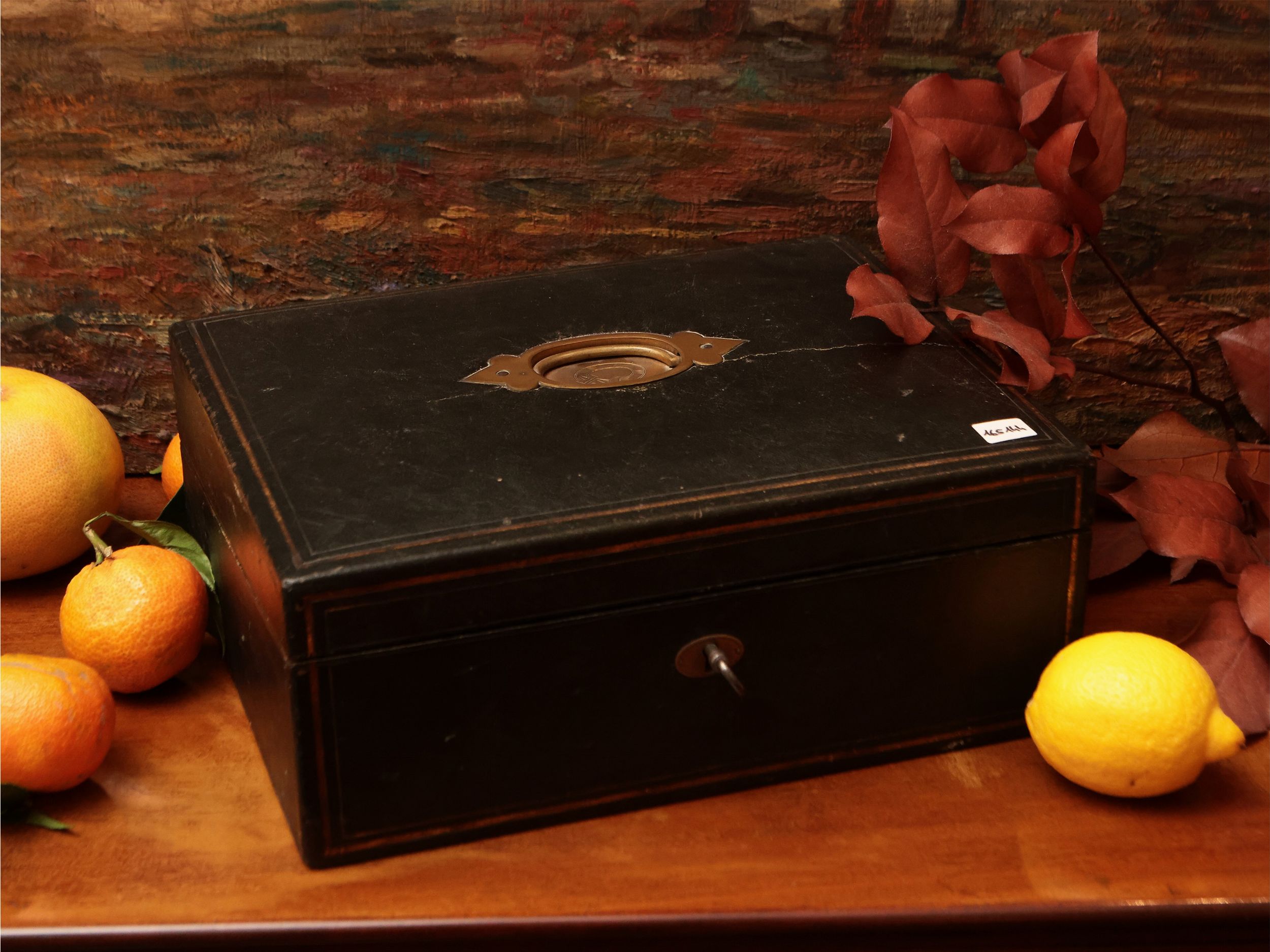 h cm 13x32x25 seconda metà del XIX secolo maniglia in ottone sul coperchio, interno rivestito in moiré verde salvia con calamaio (un'ampolla mancante), vani portapenne e carte, alcuni difetti